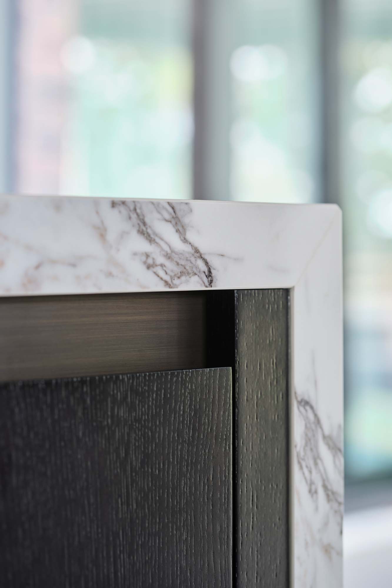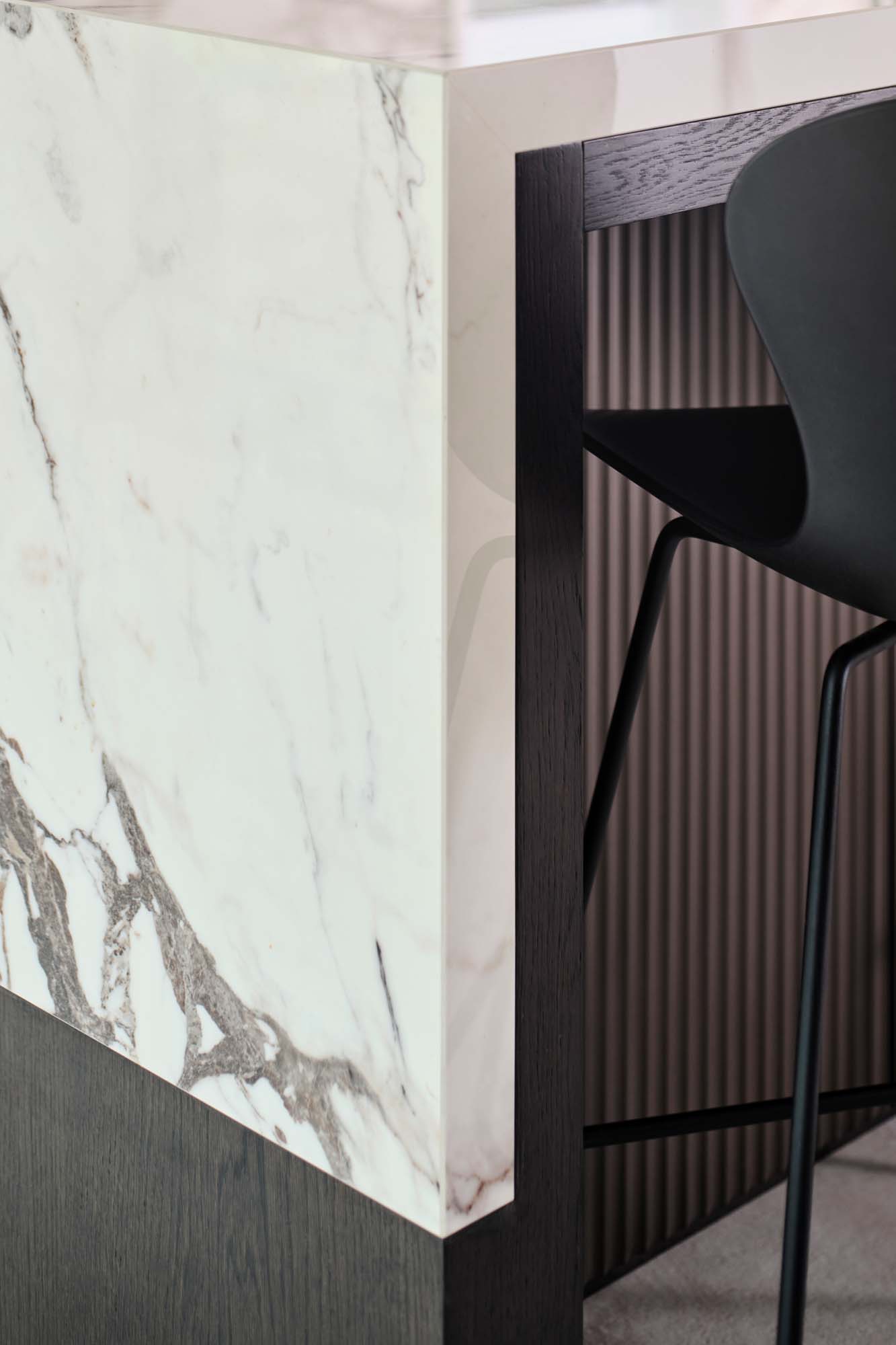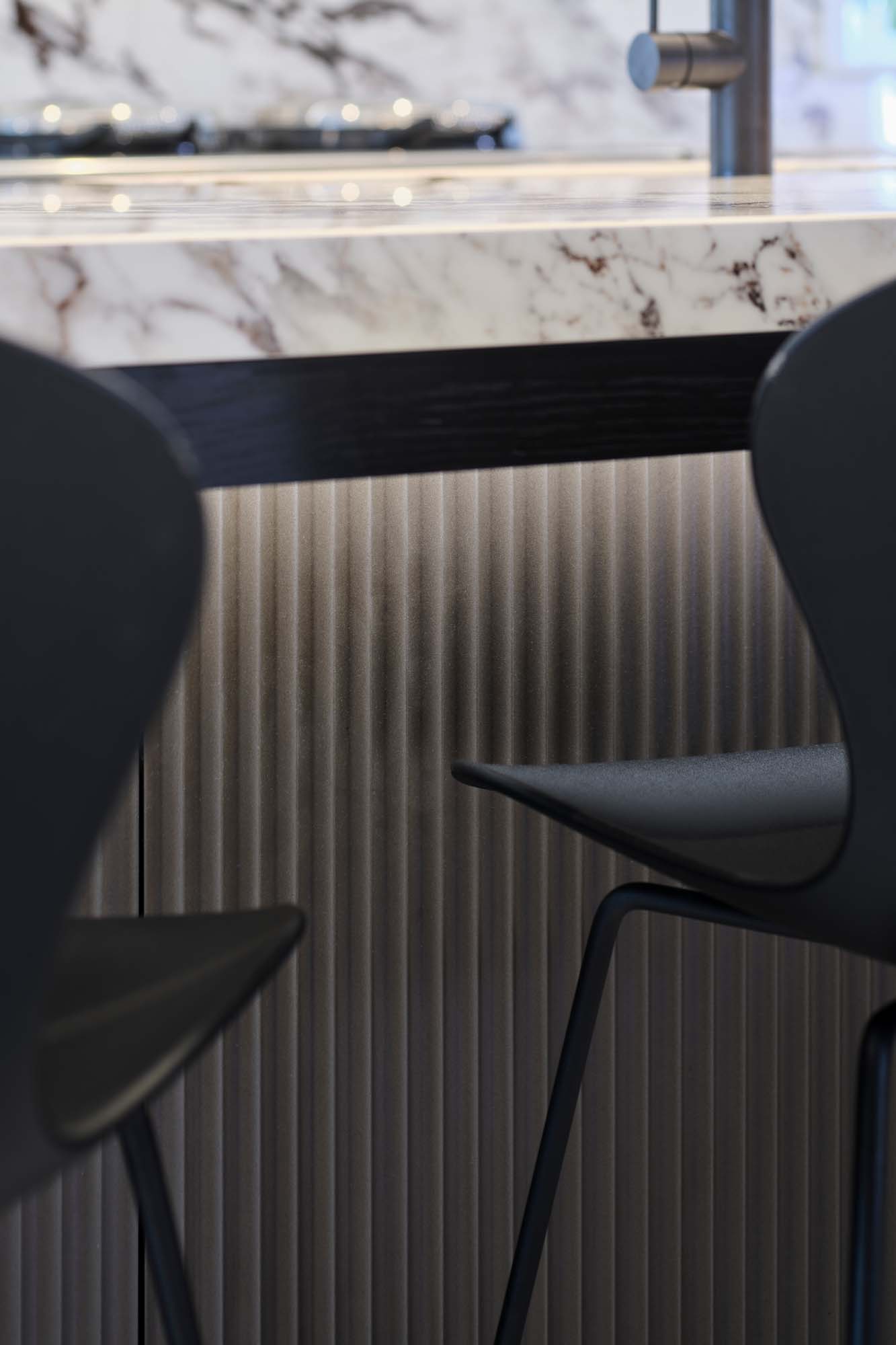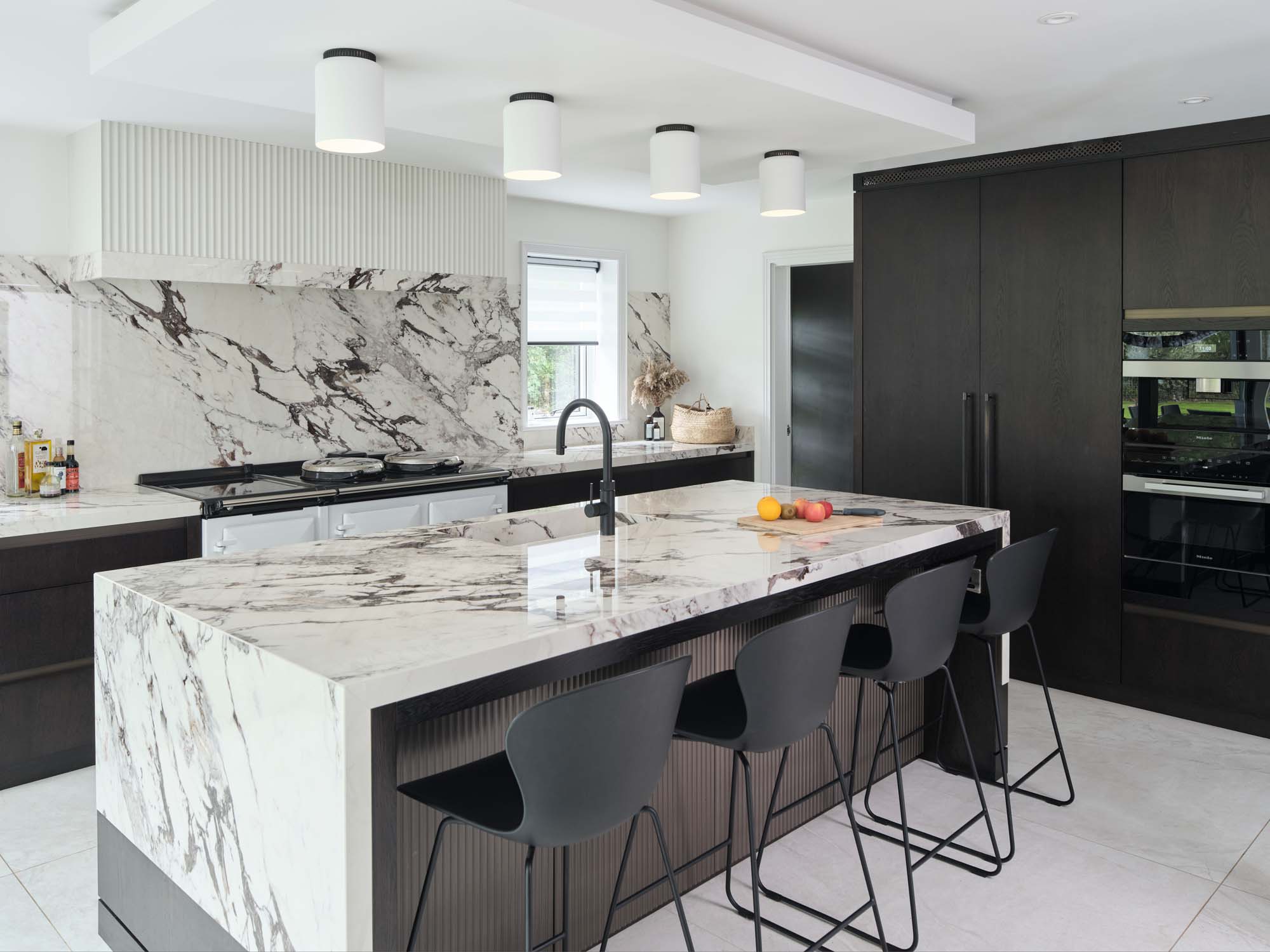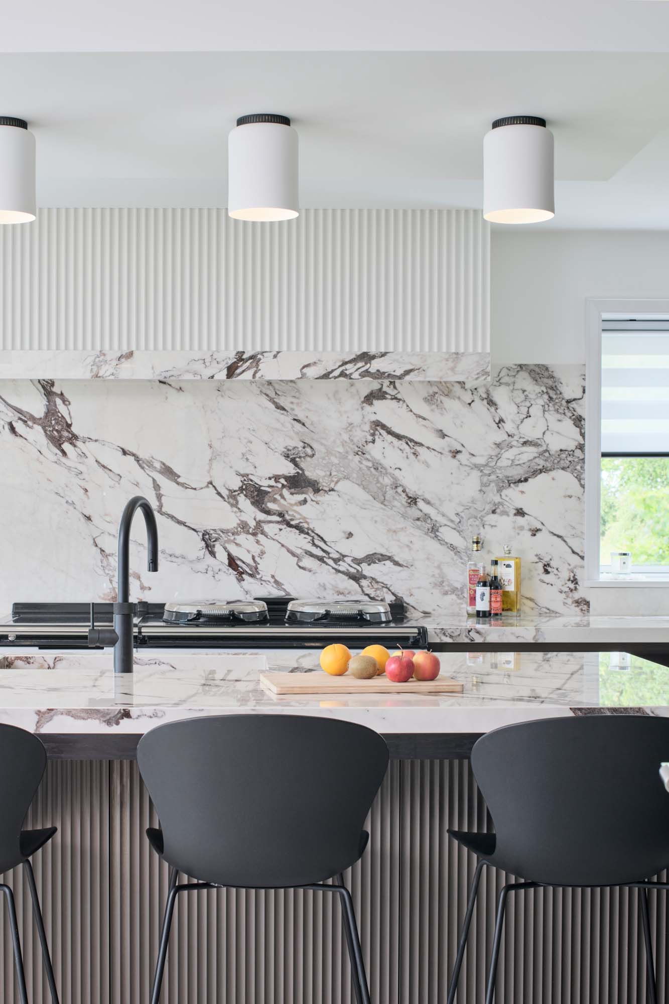 Das Erfolgsgeheimnis dieses Projekts liegt in der sorgfältigen Materialauswahl. Die Küchenarbeitsplatte und der Fliesenspiegel - beide ausgeführt unter Verwendung der großformatigen Feinsteinzeugplatten The Top Marble Look Capraia - bringen eine zeitlose Eleganz zum Ausdruck. Ihr reizvolles, von natürlichem Marmor inspiriertes Design fügt dem Ambiente eine üppige Note hinzu, während die Funktionalität der keramischen Platten für Langlebigkeit und Pflegeleichtigkeit bürgt.