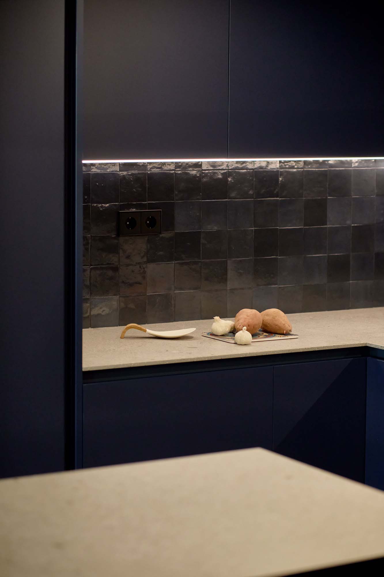 Der Boden des gesamten Hauses wurde mit der Serie Cementum im Format 120x120 cm gestaltet, wobei in den neutraleren Bereichen der Ton Ash und in der „Veta“ sowie in der Küche und den Bädern das Indigo verwendet wurde. Diese Lösung ermöglichte es, ein durchgängiges Verlegemuster beizubehalten und gleichzeitig die Farbe zu variieren, wodurch ein harmonisches chromatisches Gleichgewicht zwischen der Solidität der Grautöne und der Tiefe des Blaus entstand, das an das maritime Umfeld erinnert. Für die vertikalen Beläge wurde die Kollektion Zellige aus der Serie Crogiolo in der Farbe China (10x10 cm) verwendet, die mit ihrer glasierten Oberfläche Lichtvibrationen und changierende Reflexe erzeugt und die monochrome Palette um lebendige und dynamische Nuancen bereichert.