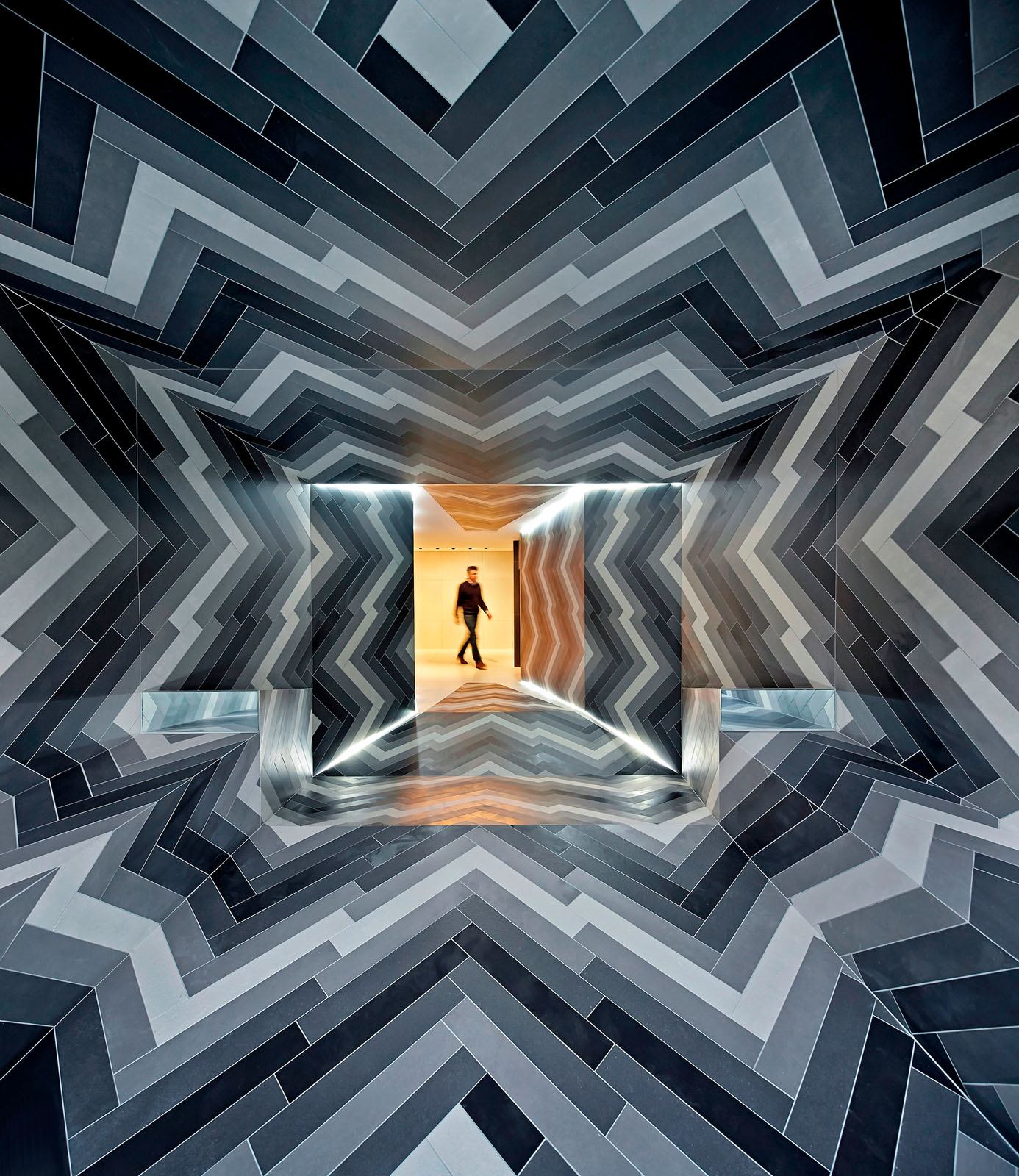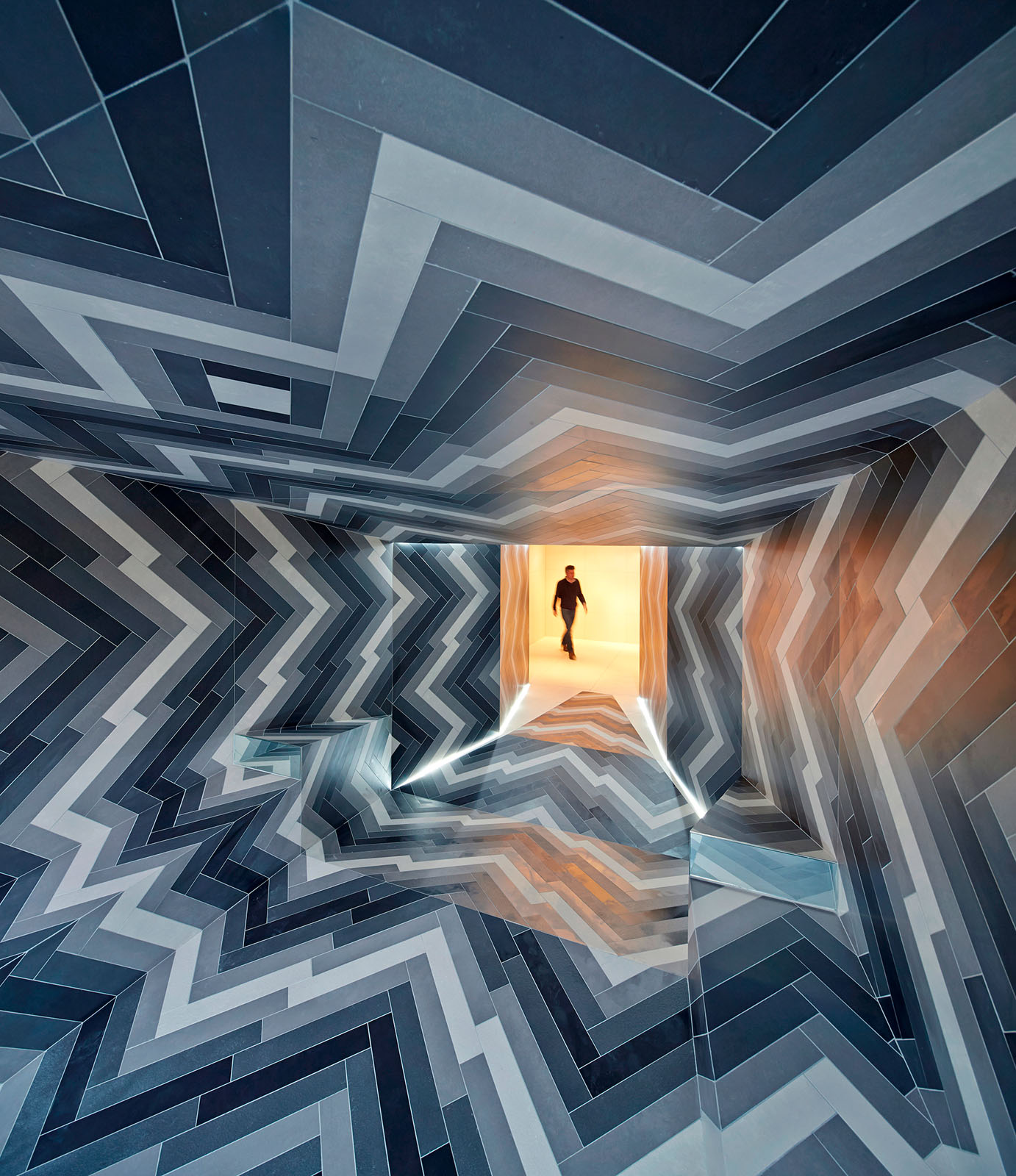 StadteinrichtungDer spektakulärste Einsatz von Feinsteinzeug in der Architektur ist in London im Stadtteil Primrose Hill zu sehen. Im Auftrag des Capitol Designer Studio verwandelten Lily Jencks und Nathanael Dorent, die Schöpfer von Pulsate, einen konventionellen Raum für den Verkauf von Fliesen in einen Ort für Kultur, in eine „pulsierende Welle“ von Kreativität. Das an Op Art und Gestaltpsychologie anknüpfende Projekt mit schrägem Boden und in die Installation integrierten Sitzgelegenheiten ist ein Spiel mit der erweiterten Wahrnehmung. Maßgeblich für den Verfremdungseffekt dieses beeindruckenden geometrischen Spiels ist die Fliese SistemN. Sie ist in einem einzigen Format, das in vier verschiedenen Farbabstufungen und drei Dimensionen durchgespielt wird, im Fischgrätverband auf dem Boden und an den Wänden verlegt. Die Stärke dieses umweltfreundlichen, hochleistungsfähigen, doppeltbeschickten Feinsteinzeugs liegt in der raffinierten Palette mit zwölf Farben und in den 14 Formaten.