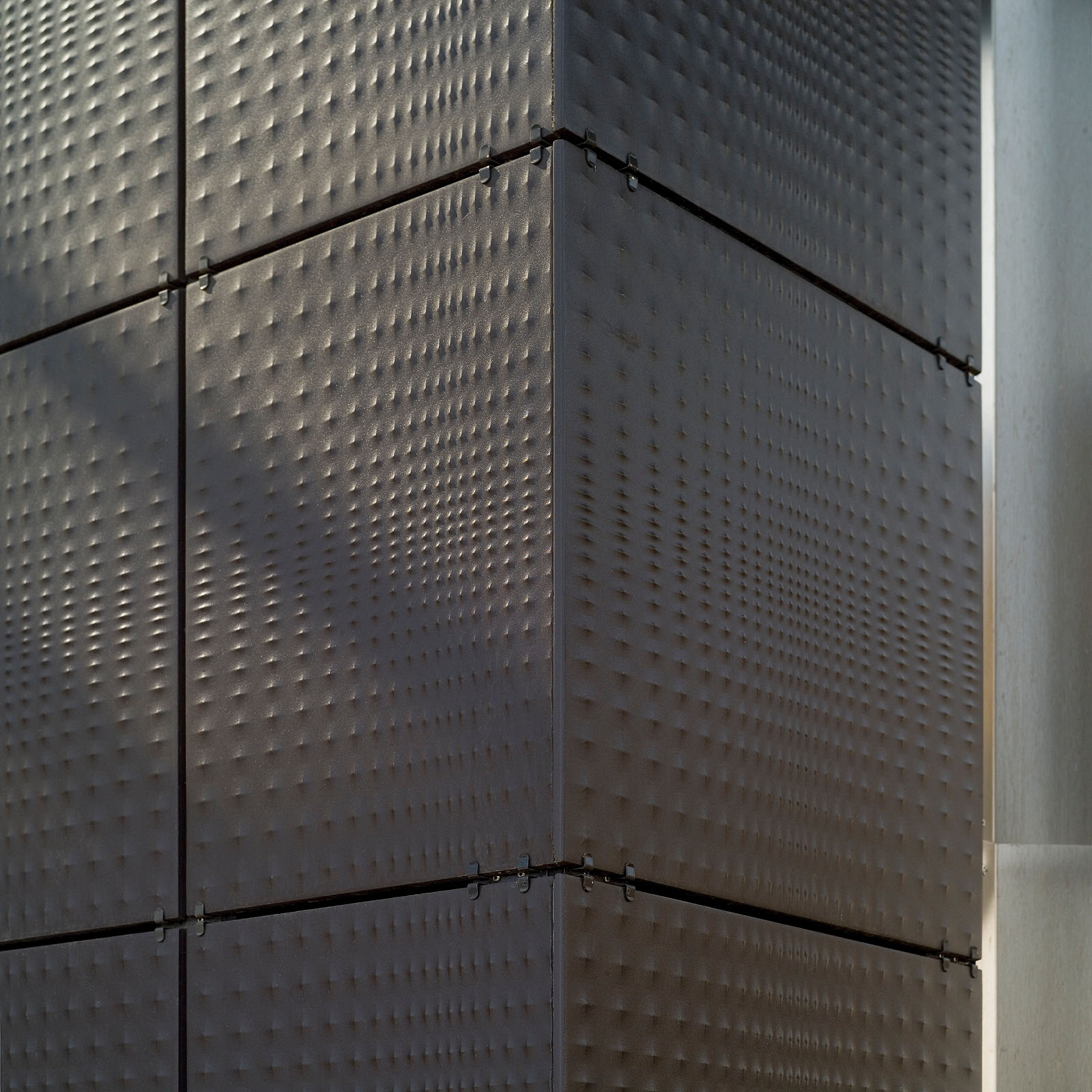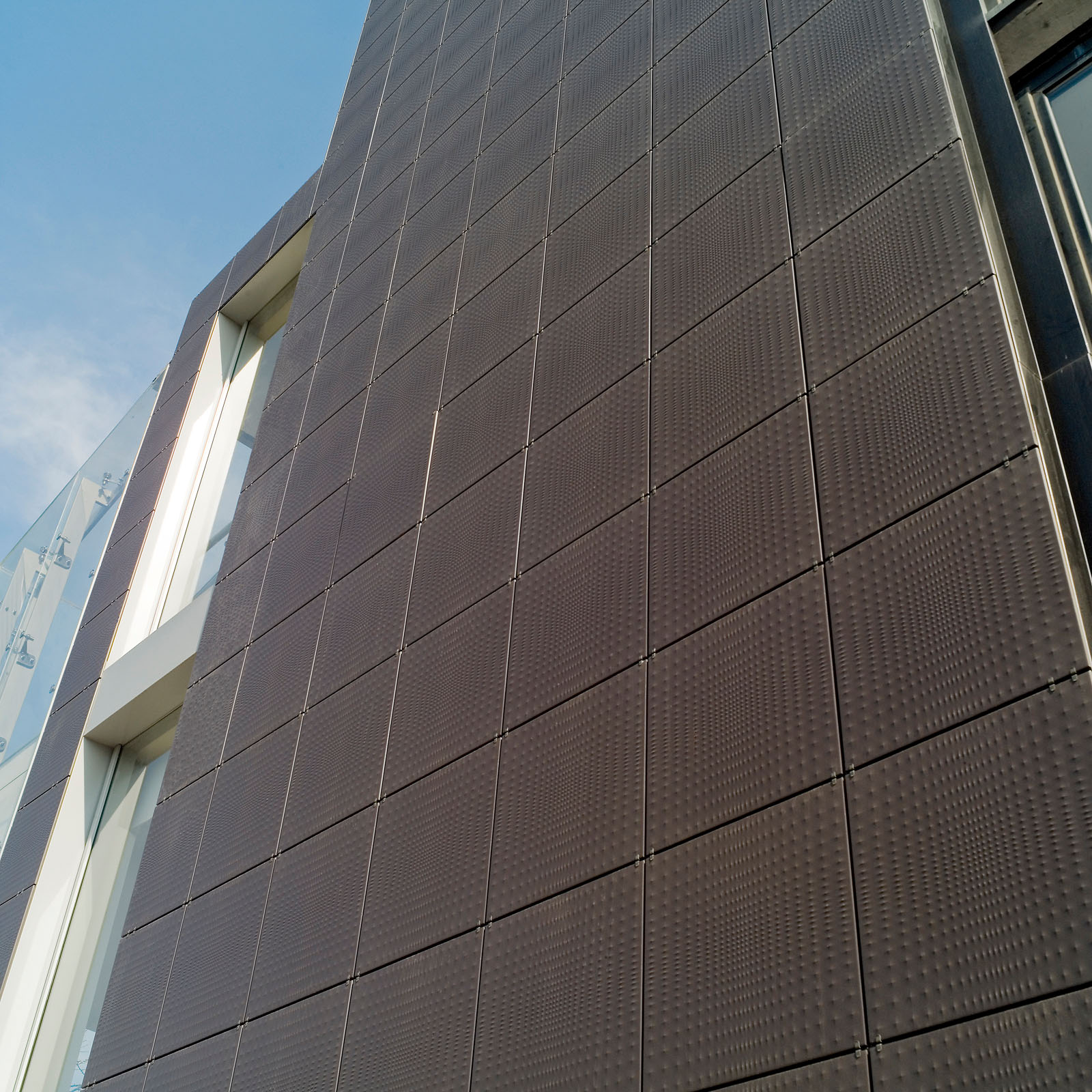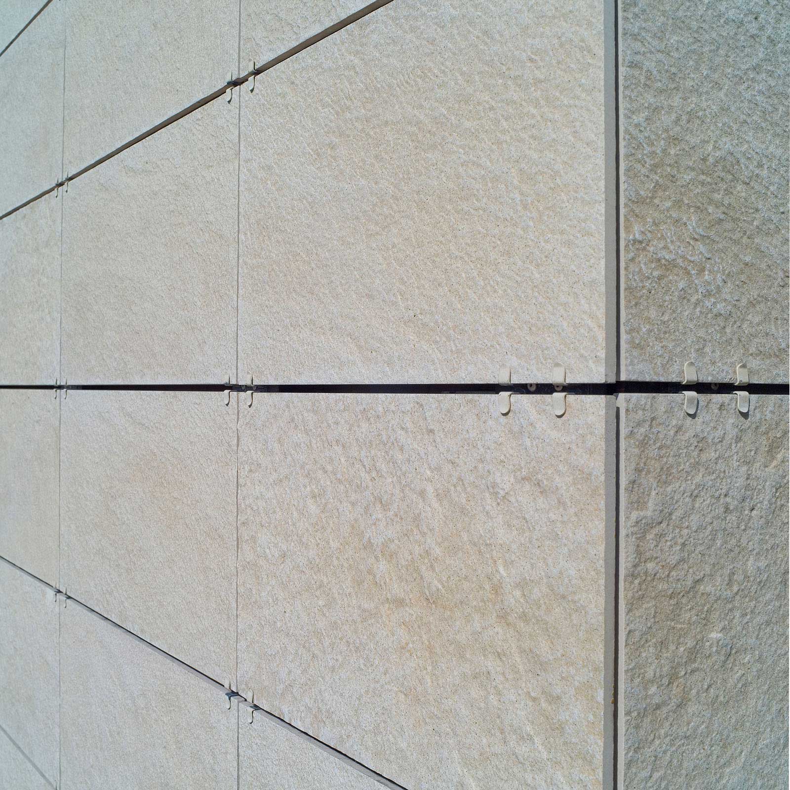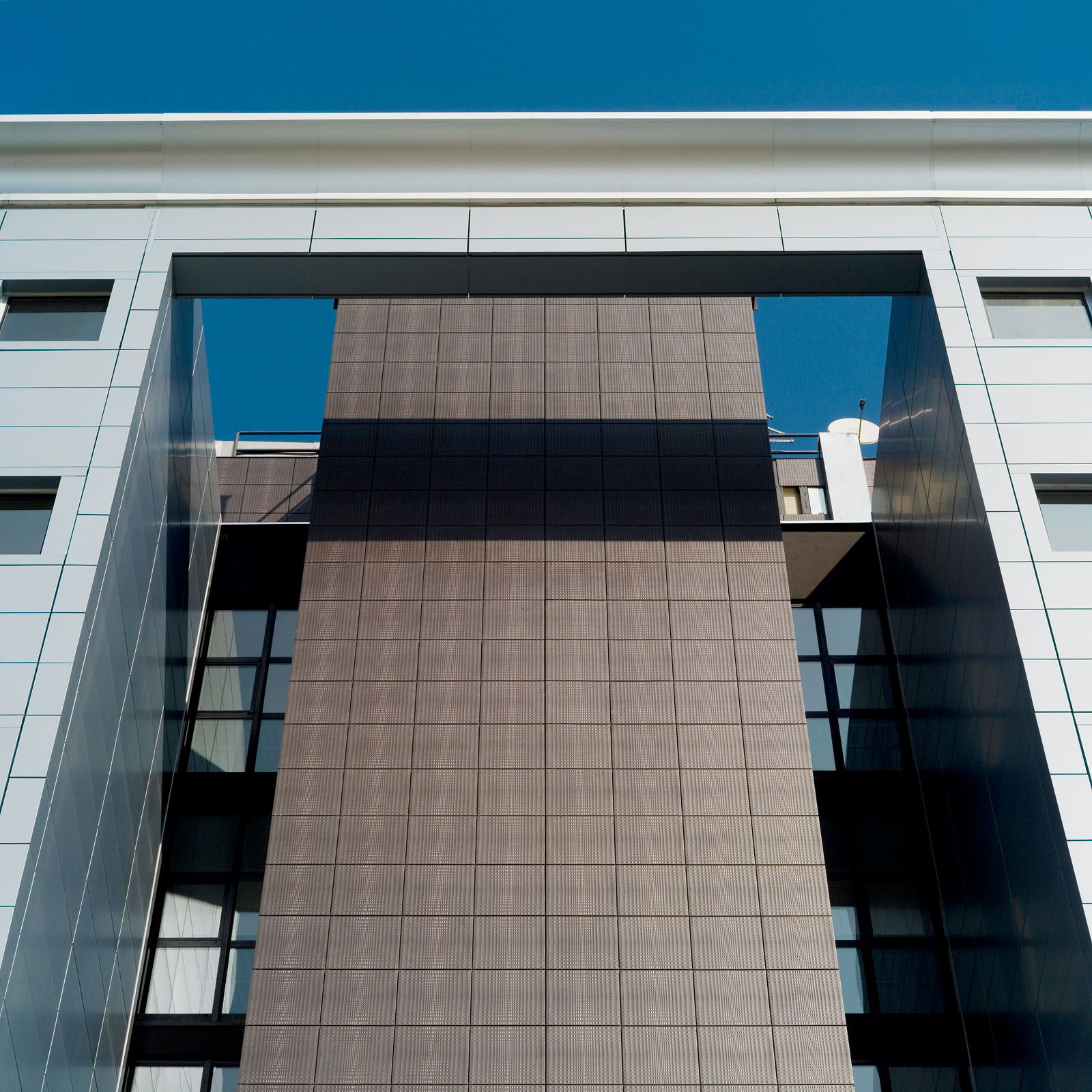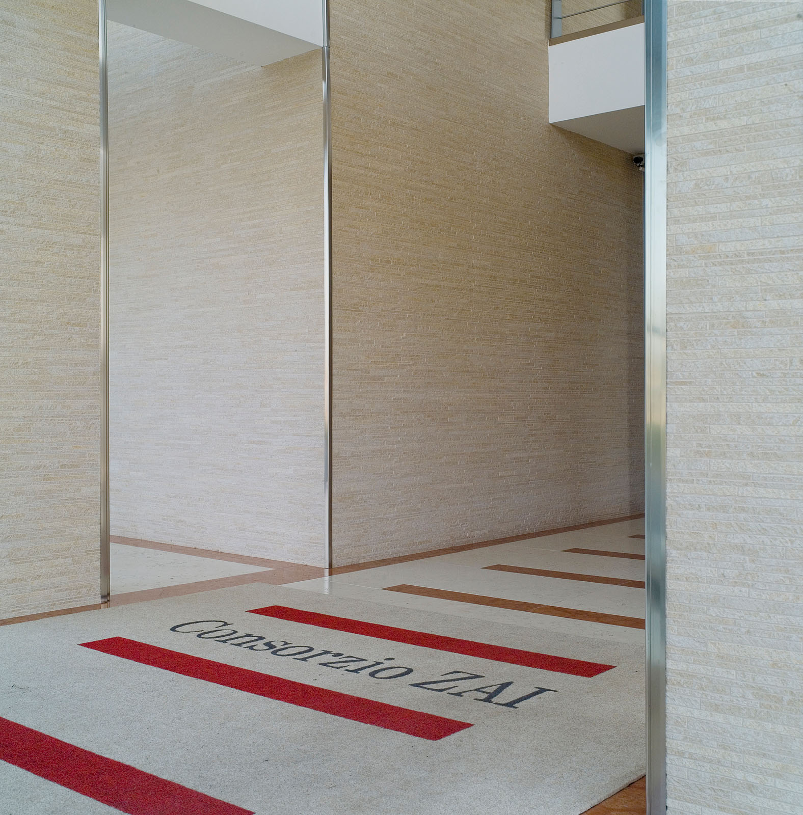 Unternehmen ansässig sind. Der große zentrale Block der Hauptniederlassung, der in den siebziger Jahren errichtet wurde, bestand auf allen Seiten aus Stahlbeton, und litt an einer Reihe von Bauschäden, die eine neue hinterlüftete Außenhaut notwendig machten, die zum Teil mit Feinsteinzeugfliesen von Marazzi und zum Teil mit Platten aus Alucobond realisiert wurde. Durch die neue keramische Verkleidung konnte der akustische Komfort erheblich verbessert werden. Die Senkung des Energieverbrauchs, die im Sommer und Winter eine Größenordnung von 30% erreichte, stellt ein weiteres Element der architektonischen Neugestaltung des Komplexes dar, der durch ein neues Sortiment an Oberflächen und Farben besondere Geltung erlangte. Die hinterlüftete Wand wurde mit sichtbaren Befestigungen ausgeführt und schlüsselfertig von Marazzi Engineering geliefert. Marazzi Engineering lieferte die Materialien, übernahm die Ausführungsplanung und die technische Gestaltung der Unterkonstruktion, wobei auch optimale Lösungen für die Zusammenstellung von Keramik und Aluminiumteilen entwickelt wurden. Besondere Sorgfalt erforderte die Reproduktion des Logos des Bauherrn auf der Keramikhaut, dieses wurde mit der Inkjet-Technik ausgeführt. Die Sanierungsarbeiten wurde mit der Verkleidung der Eingänge und Treppenhäuser des Gebäudes mit Feinsteinzeugfliesen von Marazzi abgeschlossen, die mit der Technik des Wasserstrahlschneidens geschnitten und fugenlos verlegt wurden, um die visuelle Wirkung eines kontinuierlichen Mauerwerks zu erhalten.