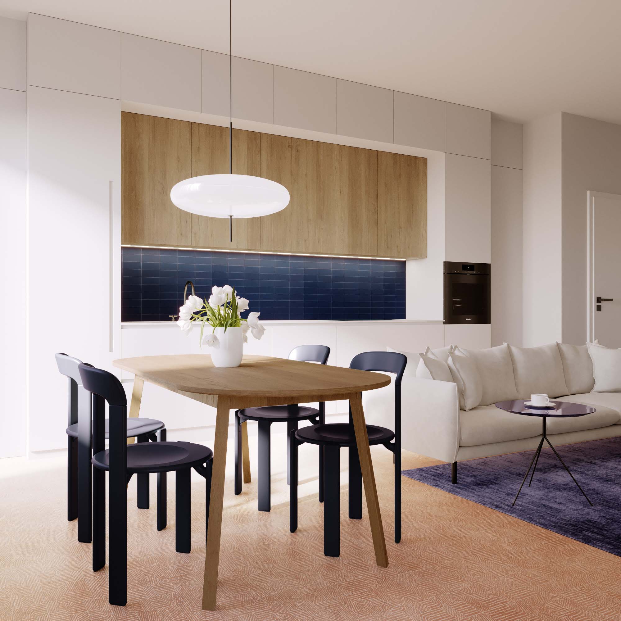 Der Boden verbindet das Wohnzimmer und die Küche mit der Gres porcellanato-Kollektion Slow im Format 75x75 cm, Decoro Rafia Cotto. „Wir haben die Slow-Kollektion für den Boden gewählt, weil wir ein Material suchten, das an die mediterrane Tradition erinnert, dabei jedoch eine moderne und vielseitige Sprache spricht“, erklären die Planer. Das Decoro Rafia zeichnet sich als eine raffinierte zeitgenössische Neuinterpretation textiler Strukturen aus. Seine Textur evoziert die Feinheit und Komplexität typischer gewebter Stoffe und verleiht den Räumen einen Hauch von Handwerkskunst und Wärme. Dieses Detail verleiht dem Boden eine einzigartige visuelle und taktile Dimension und bereichert jeden Raum mit einem Gefühl von Authentizität und Raffinesse. Das von diesem Bodenbelag reflektierte natürliche Licht verstärkt die Gesamthelligkeit und wertet gleichzeitig das Holz der Hängeschränke sowie die intensiv blaue Wandverkleidung auf.