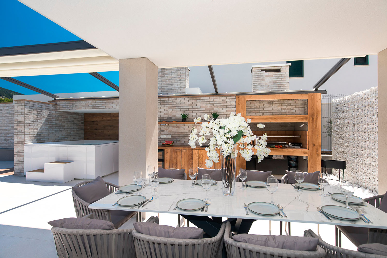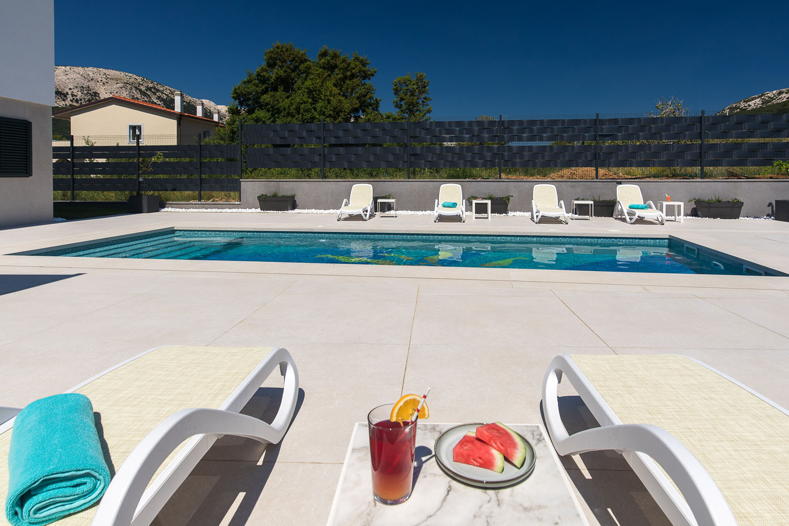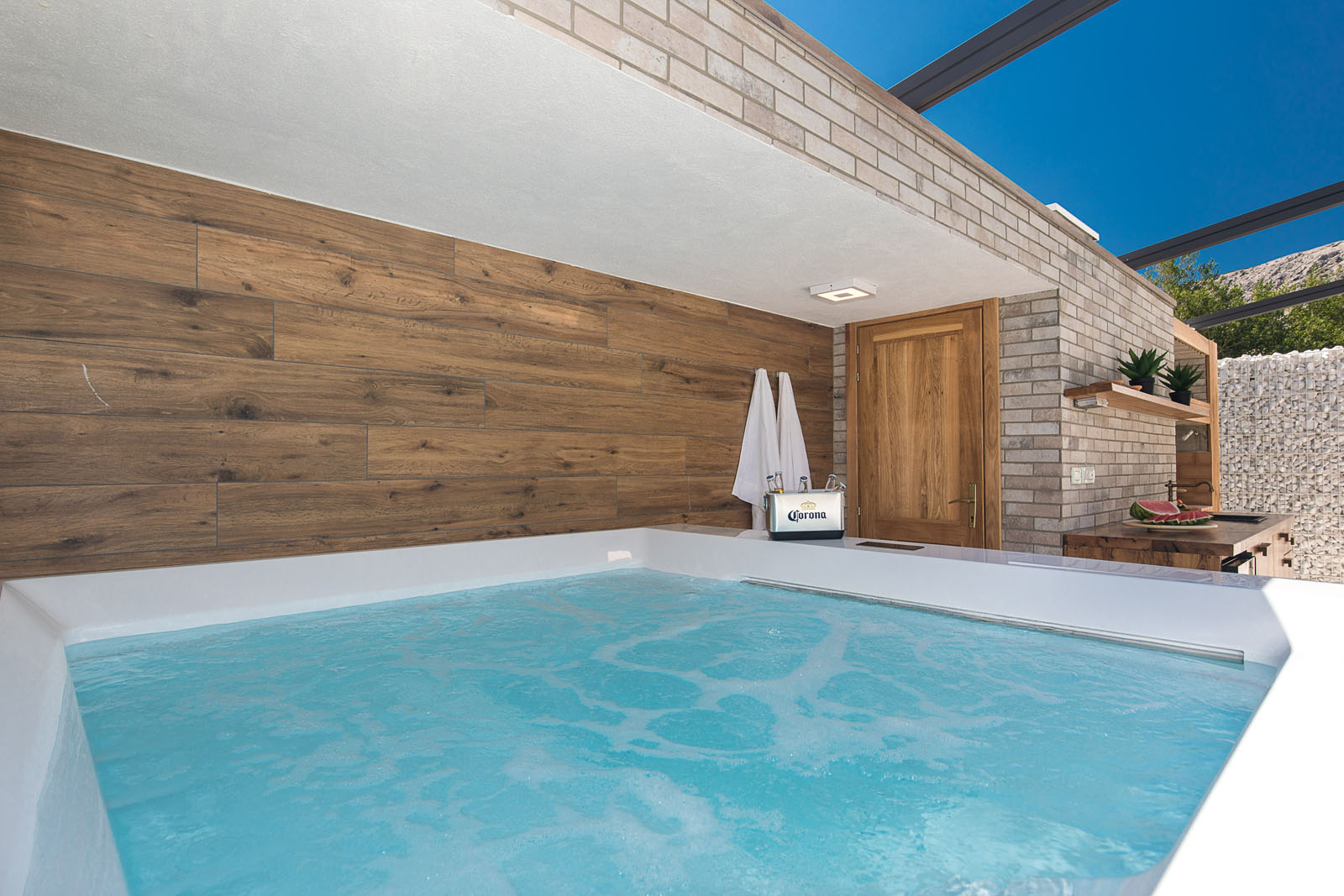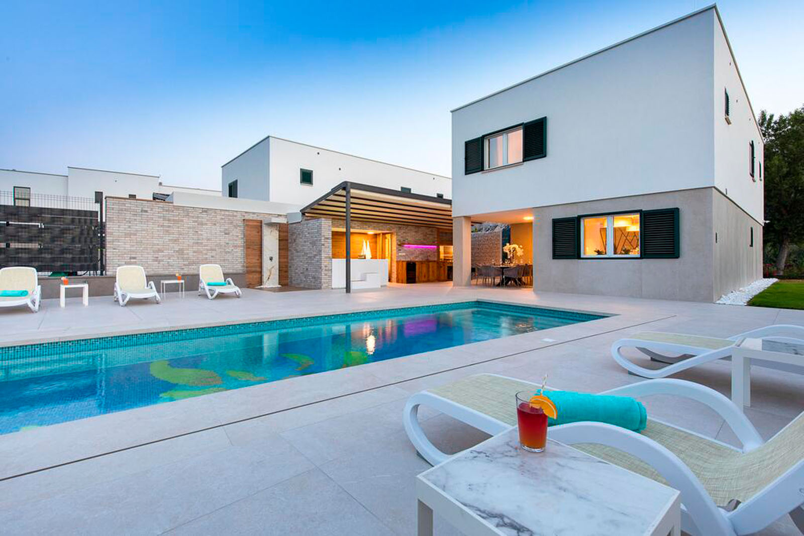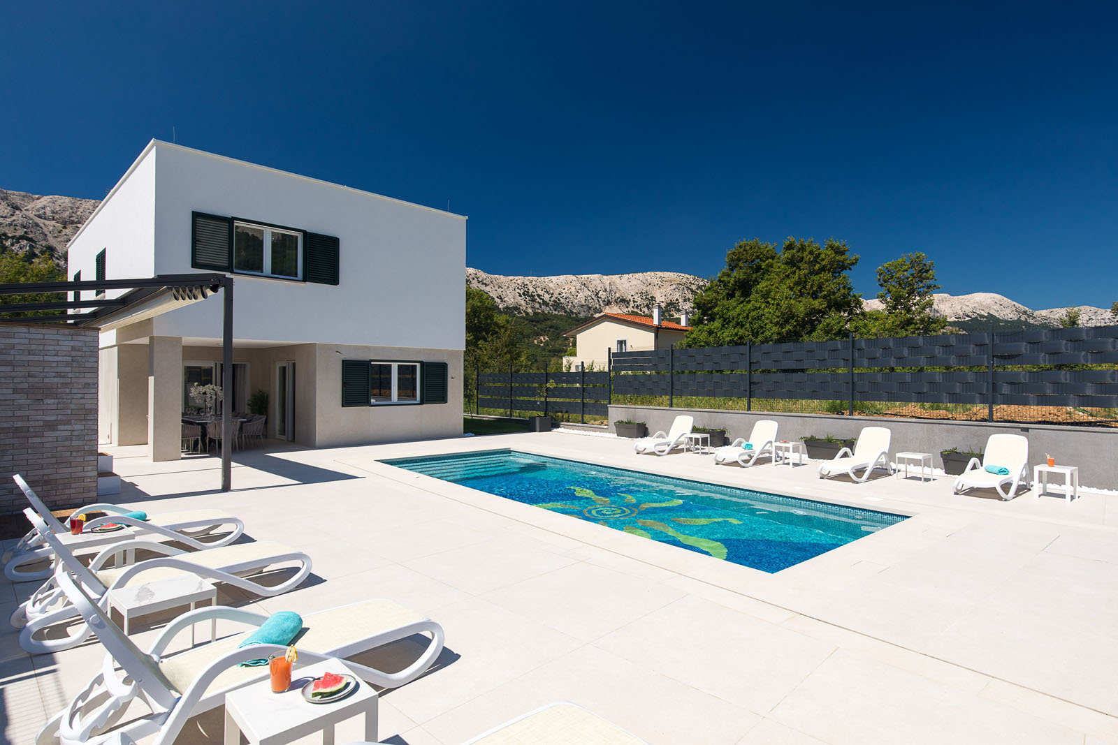 WohnungsbauIvana Babić entwarf die Villa Aurora an der äußersten Spitze der Insel Krk. Das für nur wenige Gäste gedachte Ferienhaus besteht aus vier Zimmern und einem einladenden Pool-Bereich mit einem entspannenden, schattigen Freisitz zum Essen.