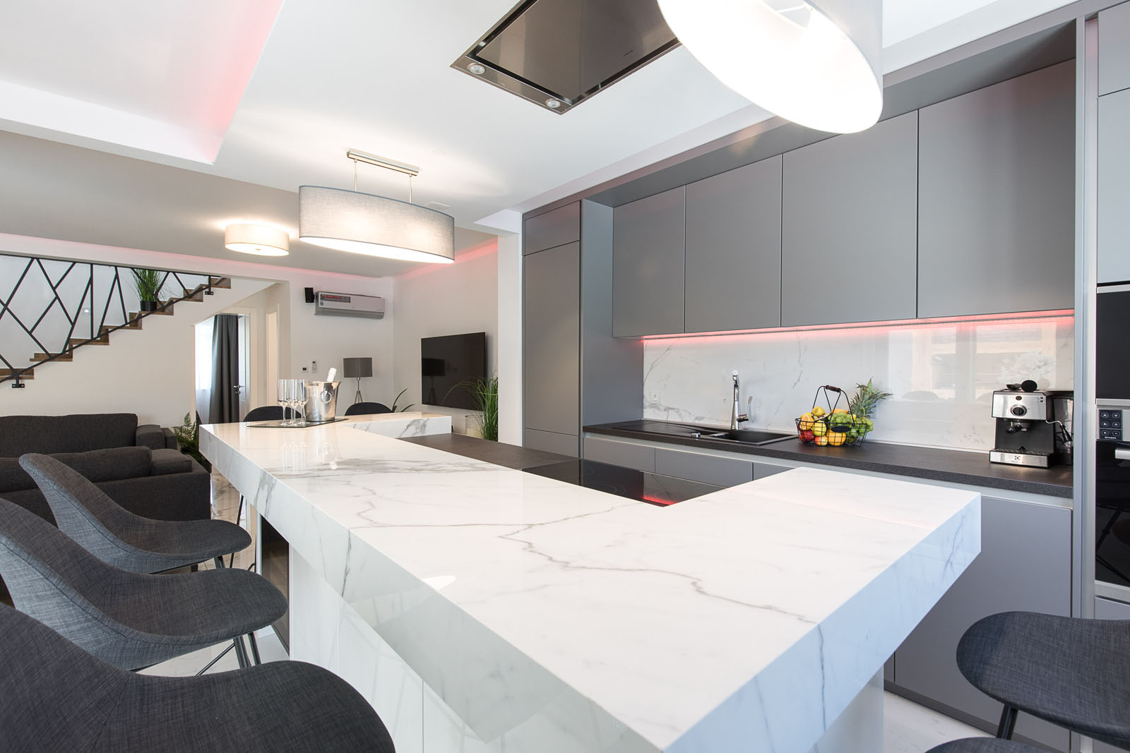 Die Marmoroptik ist auch beim Inselelement und beim Fliesenspiegel in der Küche wiederzufinden, wo die Platten The Top in der Materialstärke 12 mm eine praktische Lösung bilden, die optisch mit dem Bodenbelag integriert ist.
