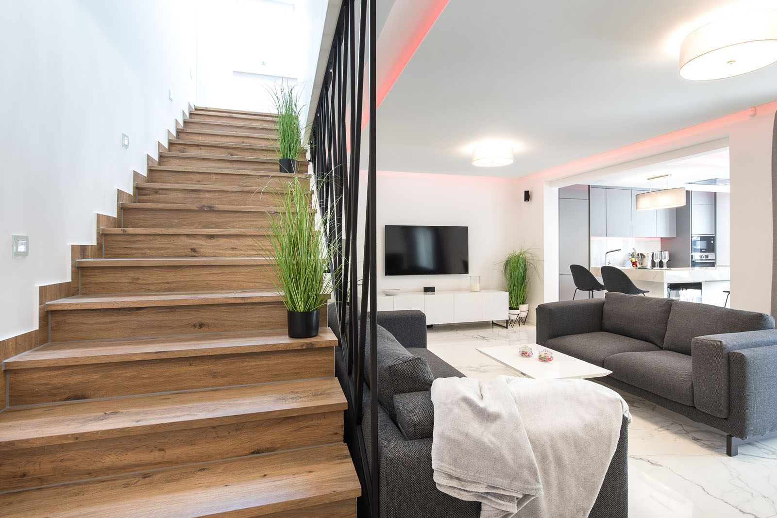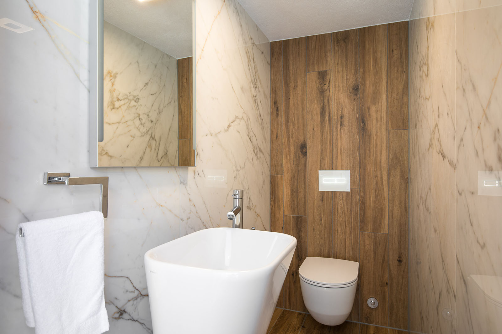 Bei der Wahl der keramischen Beläge, die ausschließlich von Marazzi stammen, ließ sich die Planerin von der bewährten Professionalität und der Produktqualität des Fliesenherstellers aus Modena überzeugen. Die Kollektion Grande Marble Look Statuario in den Varianten Lasa, Brera Grey und Golden White bekleidet den Boden im Wohn- und Küchenbereich und die Wände in den vier Badezimmern.
