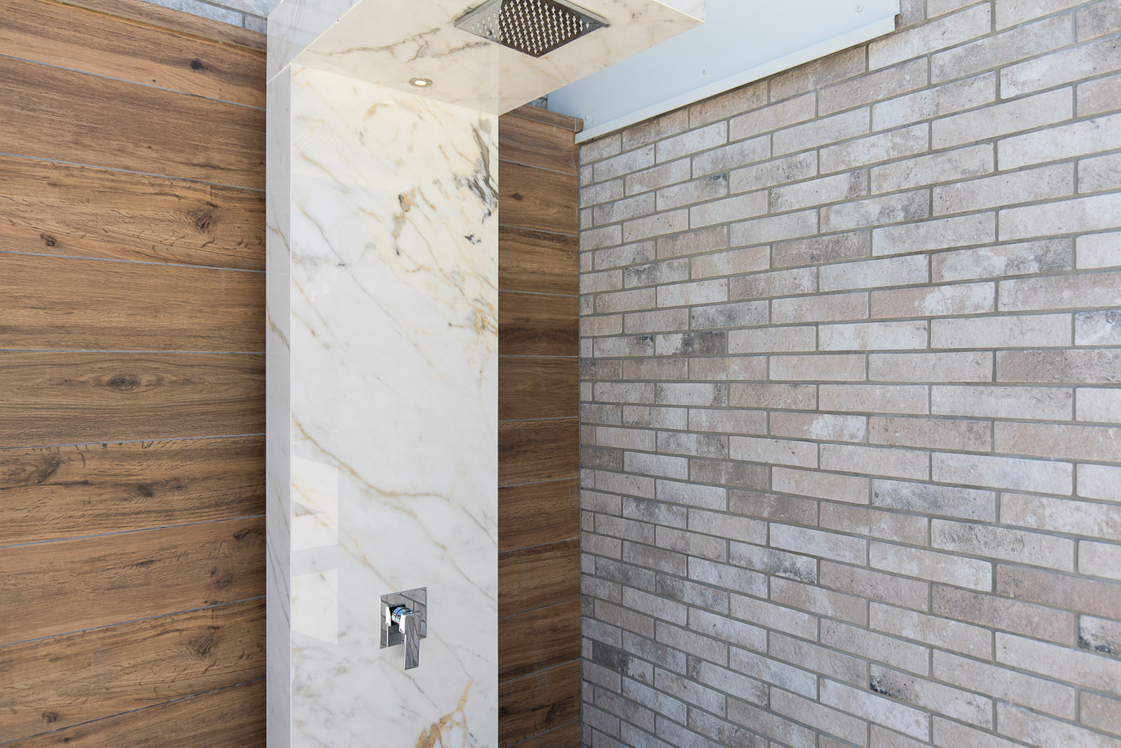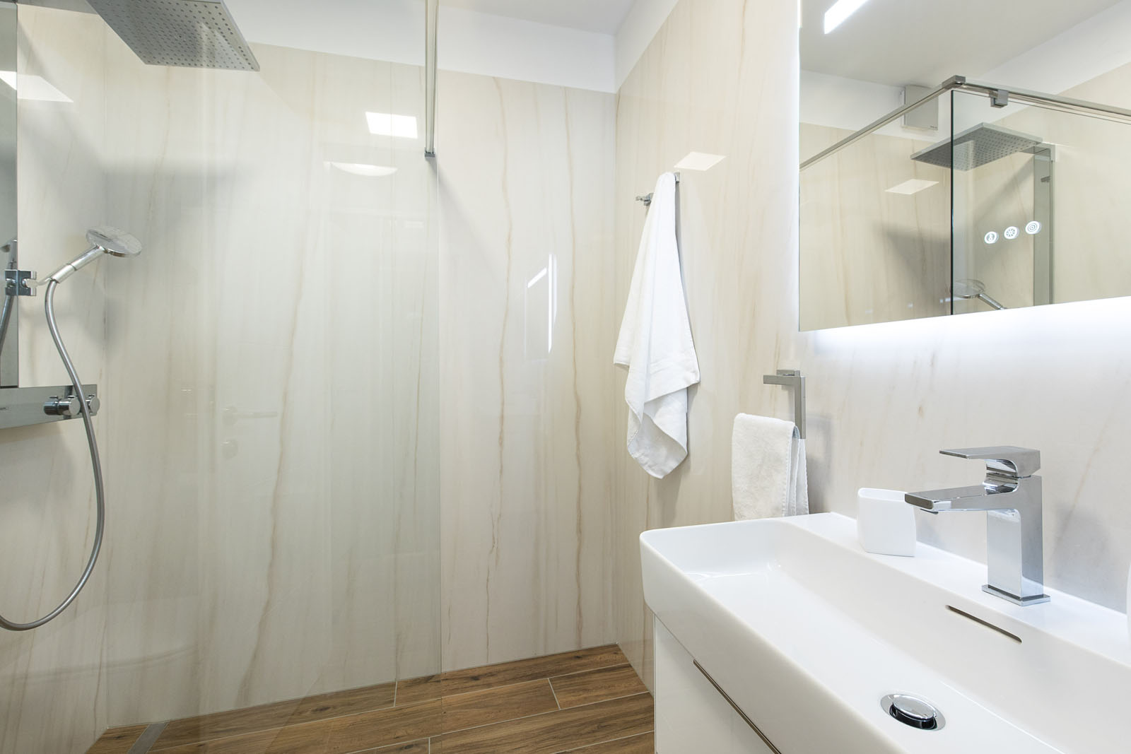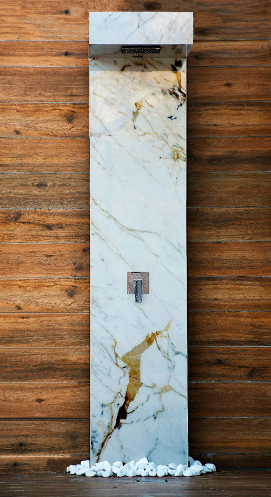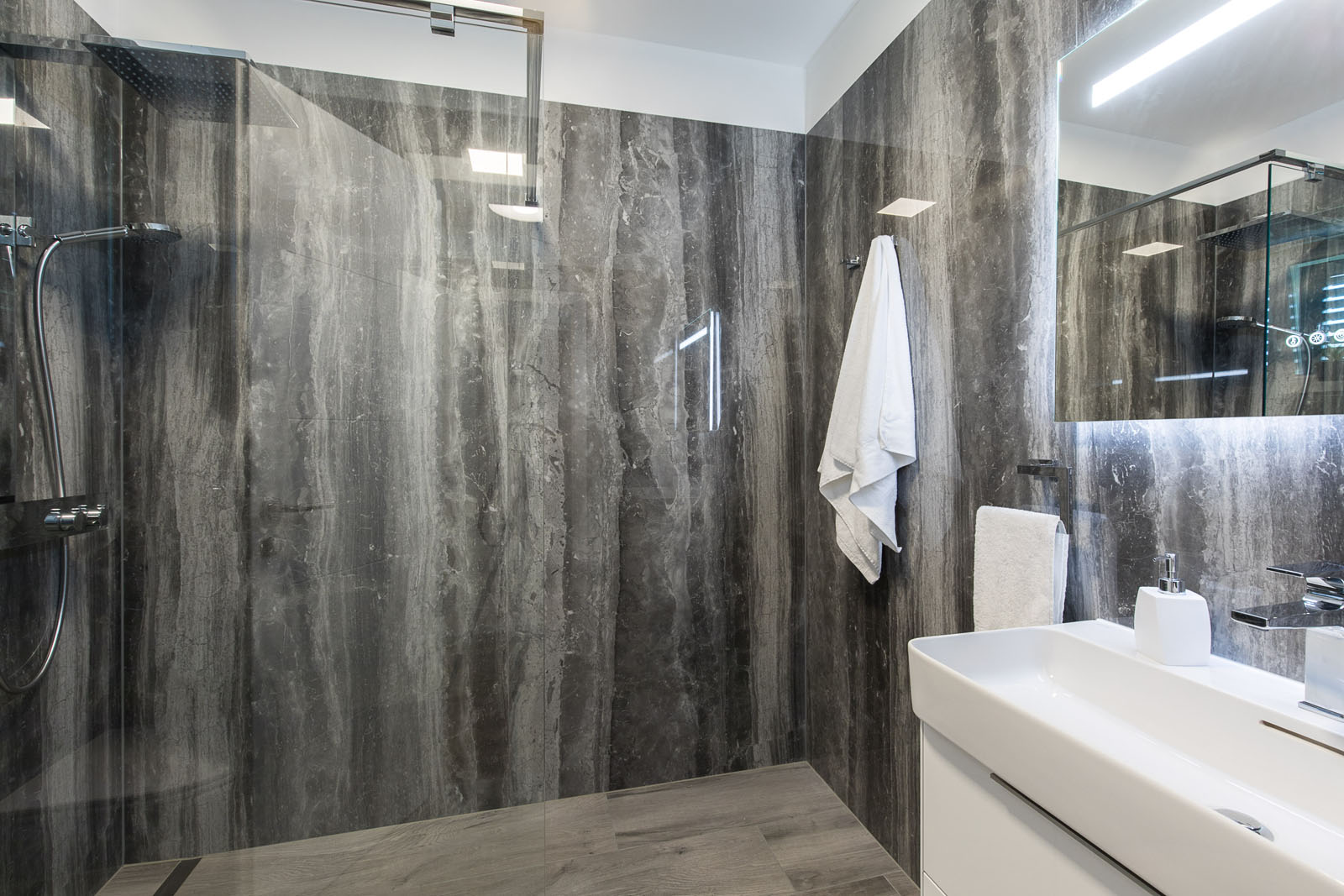 Die Treppe, die in das Obergeschoss führt, ist mit Treverktrend Rovere Scuro gestaltet, deren Holzoptik sich thematisch von der Living-Zone absetzt und in den Schlafzimmern gemeinsam mit Treverkhome in der Farbe Frassino zum Einsatz kommt. Feinsteinzeug in Holzoptik auch für den Außenbereich: es dient für die Wandverkleidung in der Ruhezone, wo eine luxuriöse Designdusche, ausgekleidet mit den 12 mm starken Platten The Top Marble Look Golden White, und ein Whirlpool entspannende Momente versprechen. Die Platten The Top Marble Look Statuario bieten Hygiene, Resistenz und Langzeitqualität. Ihre vielfältigen Einsatzmöglichkeiten in Hinsicht auf ihr Design und ihre Verwendung stellen sie auch als Tischplatten für den Esstisch und die Beistelltische im Outdoor-Bereich unter Beweis. Die Steinoptik von Mystone Limestone in der Variante High Performance lässt den Pool-Bereich in warmen Nuancen erstrahlen und gewährleistet dank der innovativen StepWise Technologie eine ausgezeichnete Rutschhemmung. Die Serie ist in drei Oberflächen, darunter Velvet und Reliefiert, in zwei 20 mm dicken Formaten sowie in den neuen Maßen 120x120 und 60x120 cm in der extraflachen Ausführung von 6 mm erhältlich.