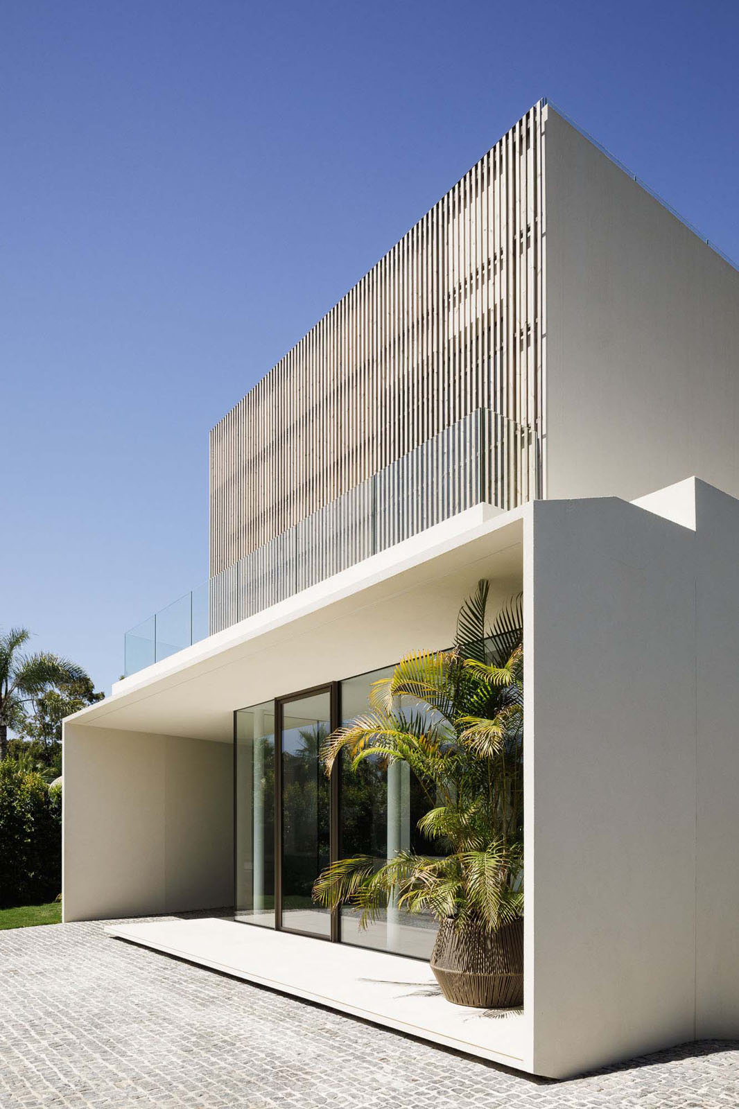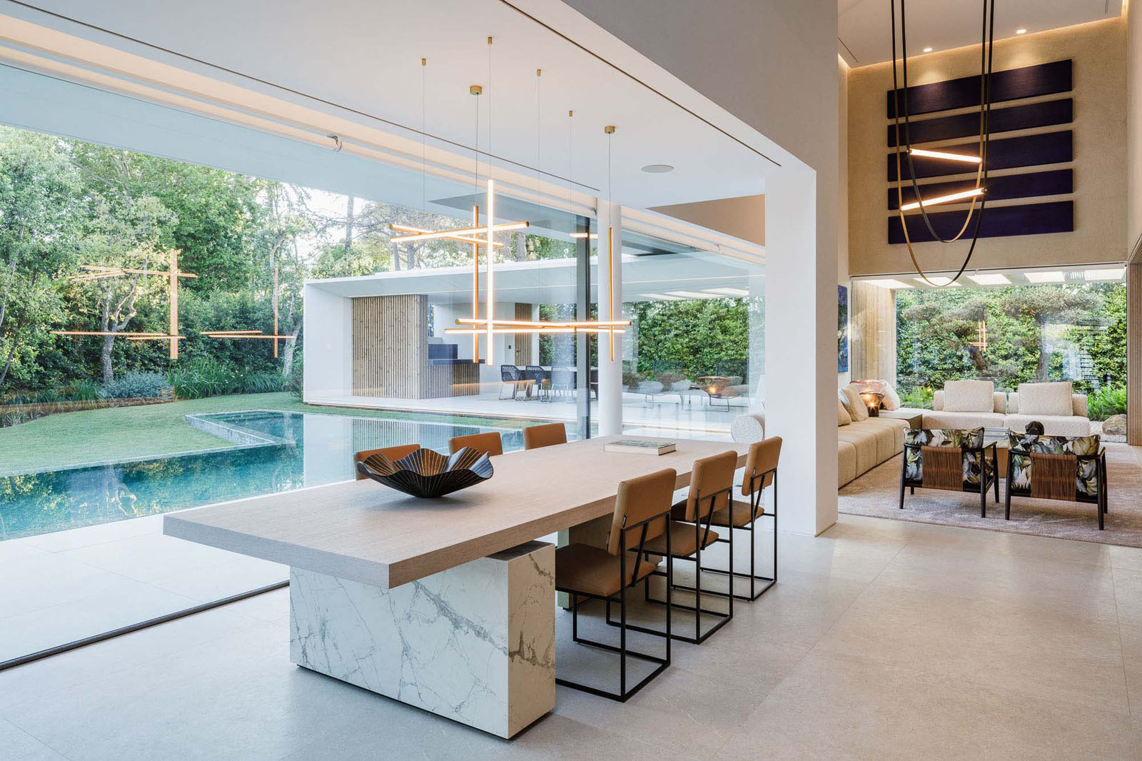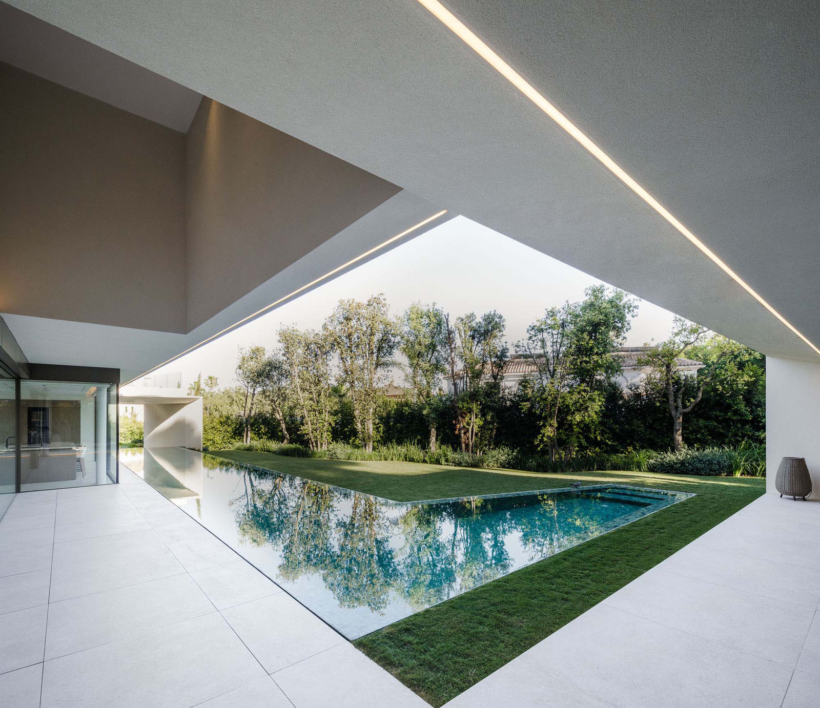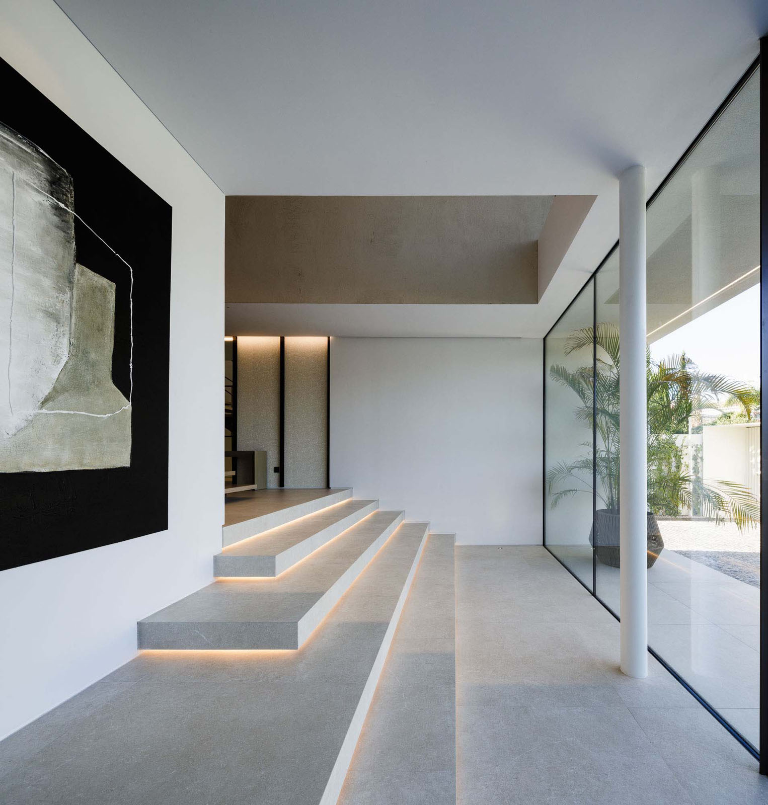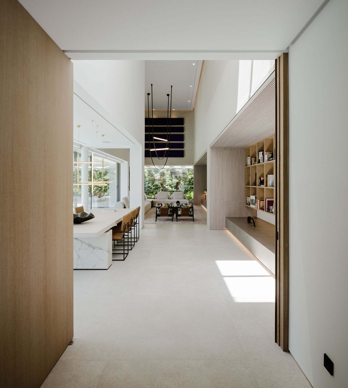 WohnungsbauEine moderne Villa zelebriert das Leben im Freien und den Sinn für Nachhaltigkeit. Die großzügige Verwendung von Feinsteinzeug erschafft ein visuelles Kontinuum zwischen drinnen und draußen.