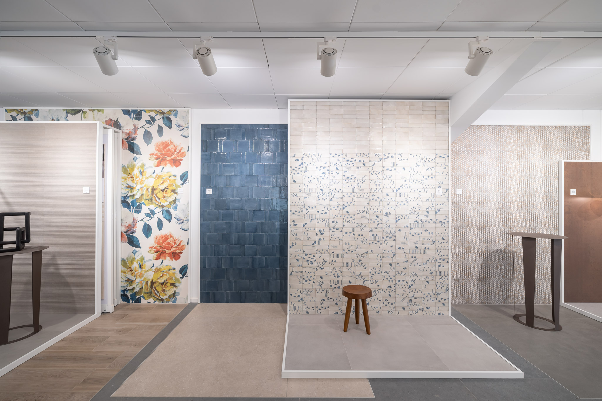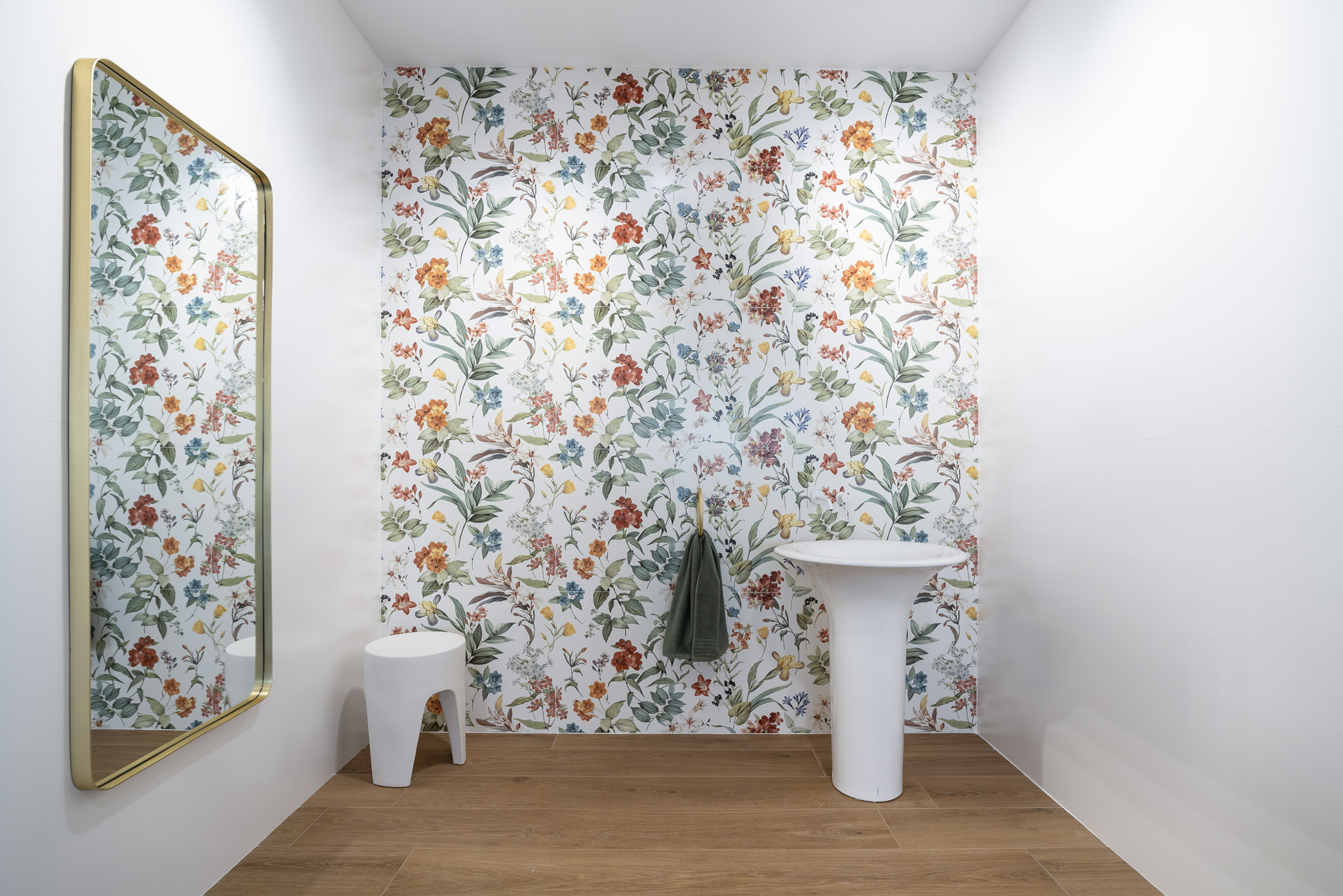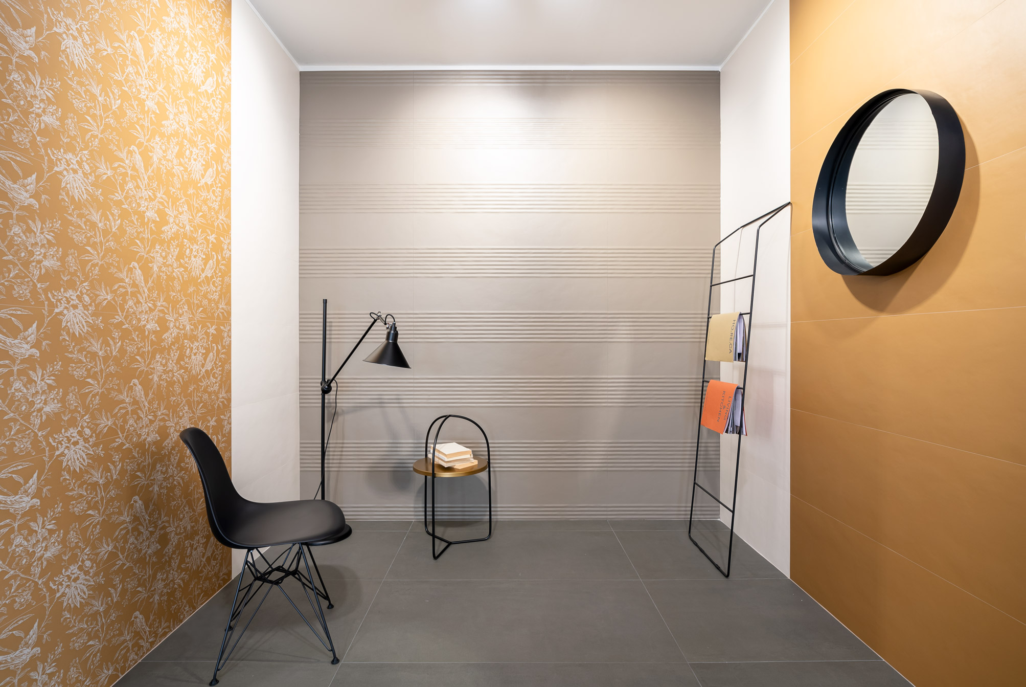 Das Obergeschoss ist hingegen ganz der Welt der Wandverkleidungen gewidmet: extraflache und normal starke Wandfliesen, Fliesen im Ziegelfomat, die an klassische Majoliken erinnern, extragroße Platten bis zu 60x180 cm; einfarbig, mit 3D-Effekten, geometrischen und floralen Mustern oder Tapetenoptik. Anhand von Raumkonzepten können Besucher das umfassende Angebot von Marazzi schätzen, das für jede planerische Anforderung eine Lösung bietet, auch unter dem Aspekt der Nachhaltigkeit.