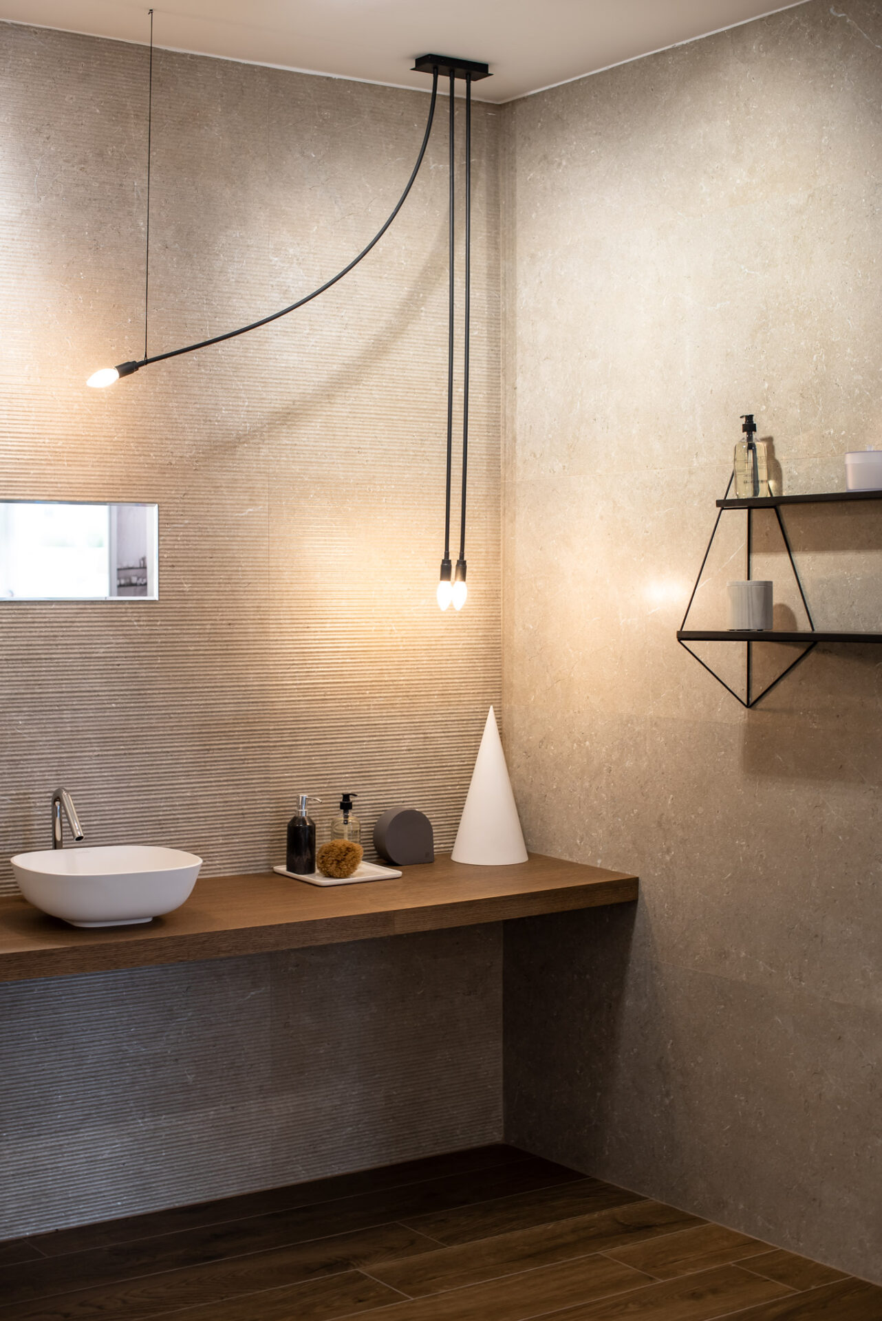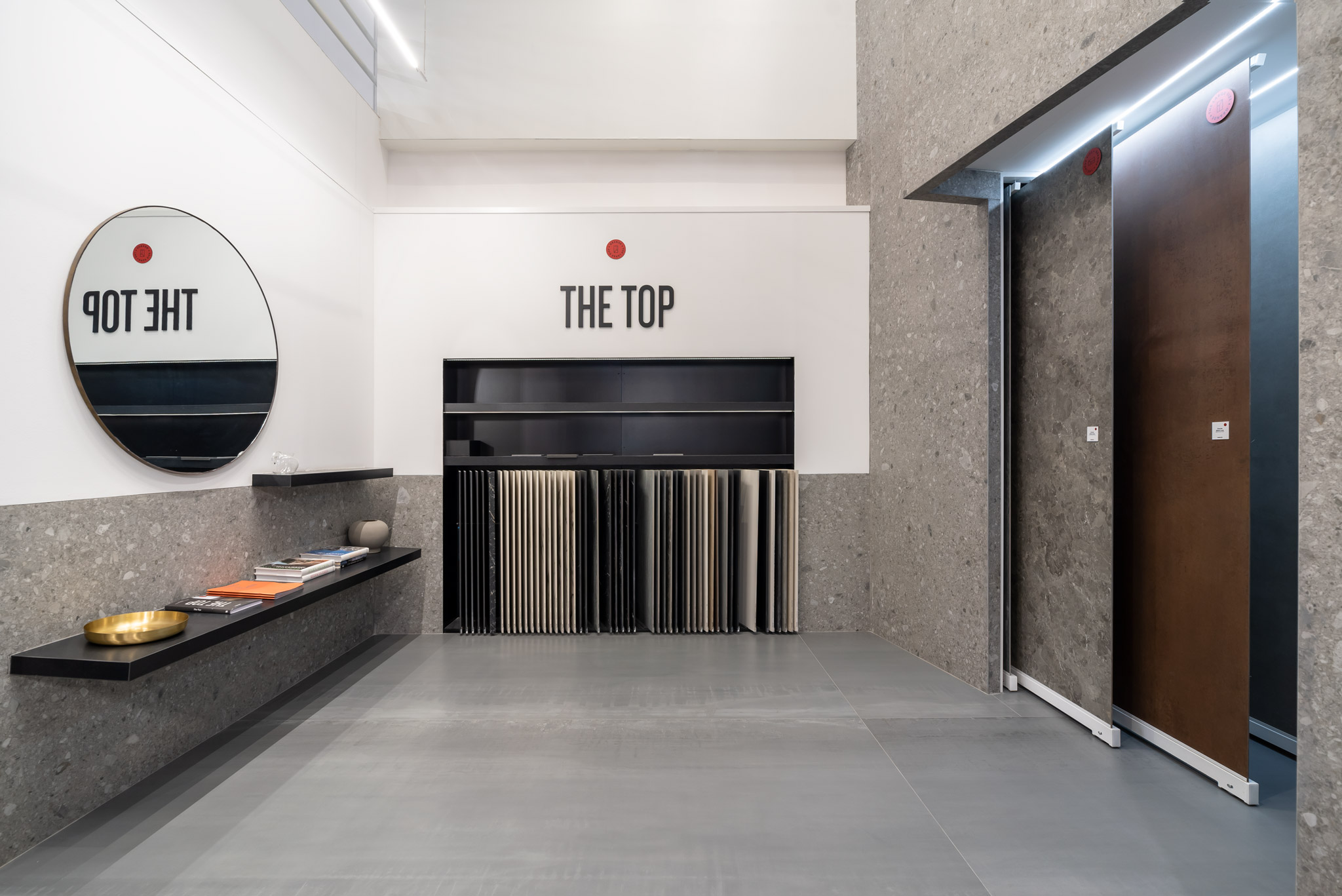 Im Erdgeschoss werden die neuesten Feinsteinzeugkollektionen von Marazzi für den Innen- und Außenbereich in den verschiedenen Optiken (Marmor, Holz, Stein und Beton), die Kleinformate der Serie Crogiolo, handwerklich anmutende Materialien, die sich durch Unregelmäßigkeiten und kräftige Farben auszeichnen, sowie die breite Palette der Feinsteinzeugplatten Grande und The Top in verschiedenen Stärken (6 - 12 - 20 mm) für die Gestaltung von horizontalen und vertikalen Flächen, aber auch von Küchenarbeitsplatten, Waschtischen, Tischplatten und Einrichtungselementen präsentiert.