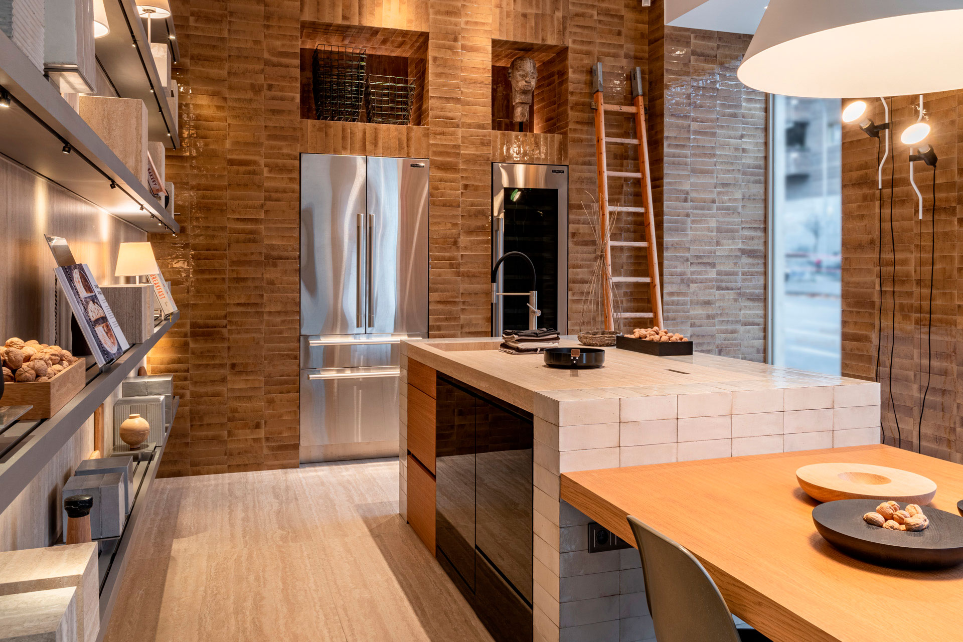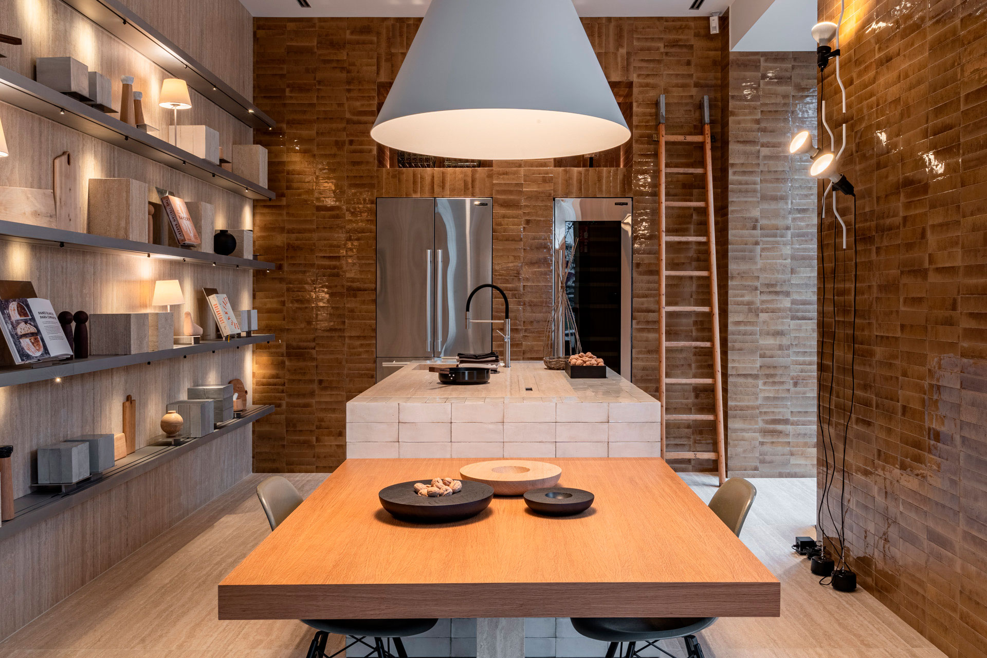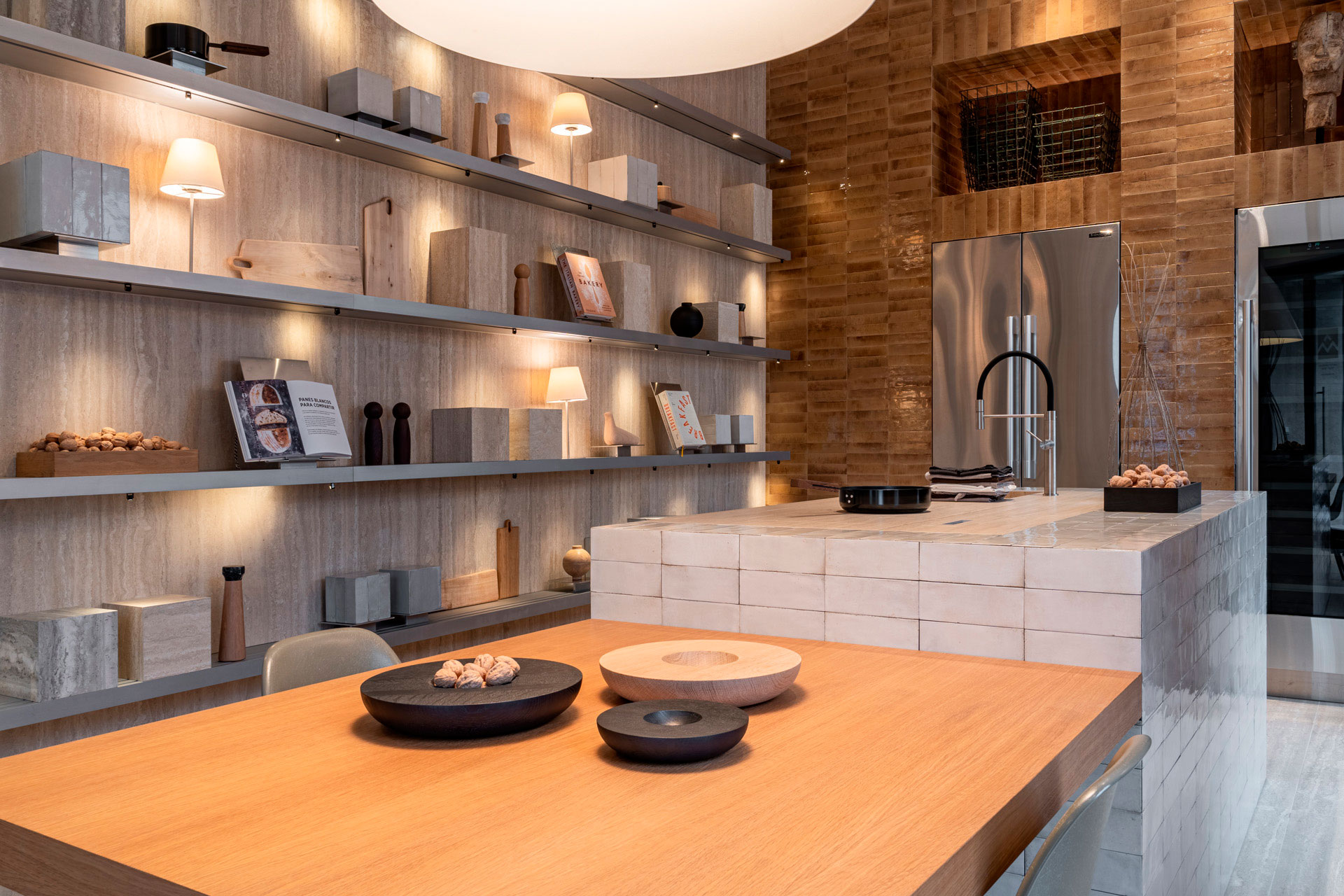 Die Besucher werden in einem geselligen Raum empfangen: The Welcoming Room ist nach dem Konzept einer Living Kitchen gestaltet, bei der die Gestaltungsvielfalt der großformatigen Feinsteinzeugplatten und die vibrierende Leuchtkraft der Kleinformate der Kollektion Crogiolo in einen Dialog treten und so die Bereiche und Funktionen der Küche miteinander verbinden.