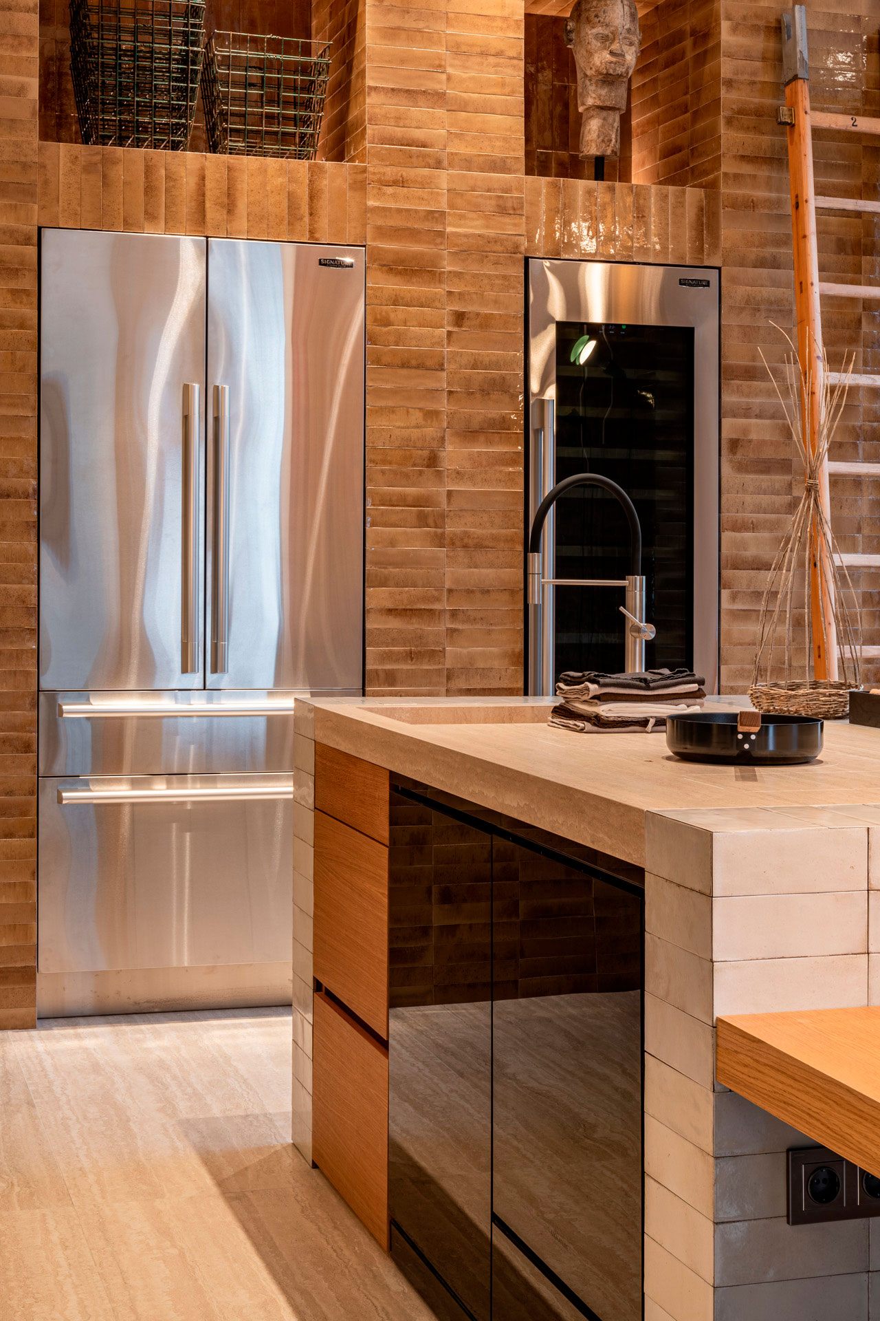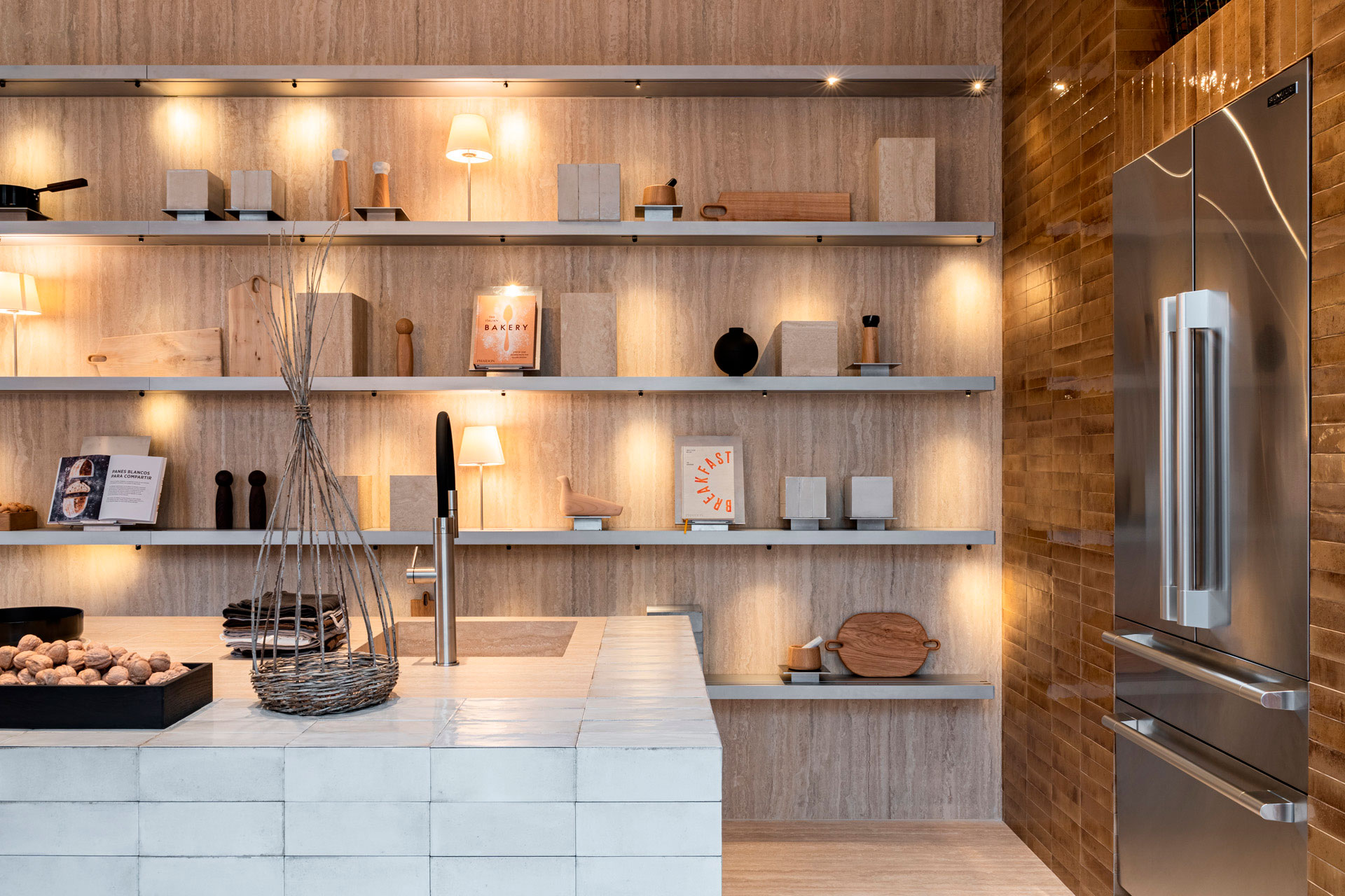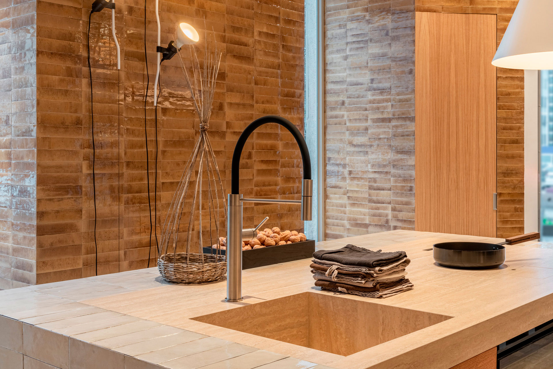 Die Besucher werden in einem geselligen Raum empfangen: The Welcoming Room ist nach dem Konzept einer Living Kitchen gestaltet, bei der die Gestaltungsvielfalt der großformatigen Feinsteinzeugplatten und die vibrierende Leuchtkraft der Kleinformate der Kollektion Crogiolo in einen Dialog treten und so die Bereiche und Funktionen der Küche miteinander verbinden.