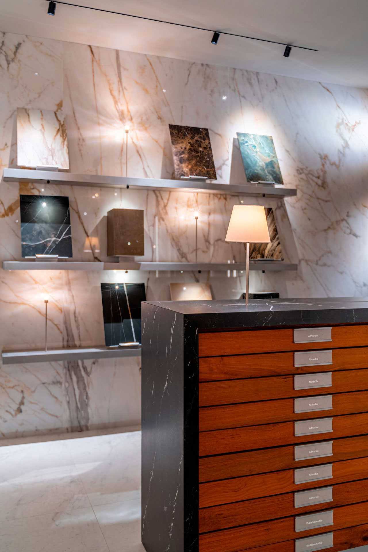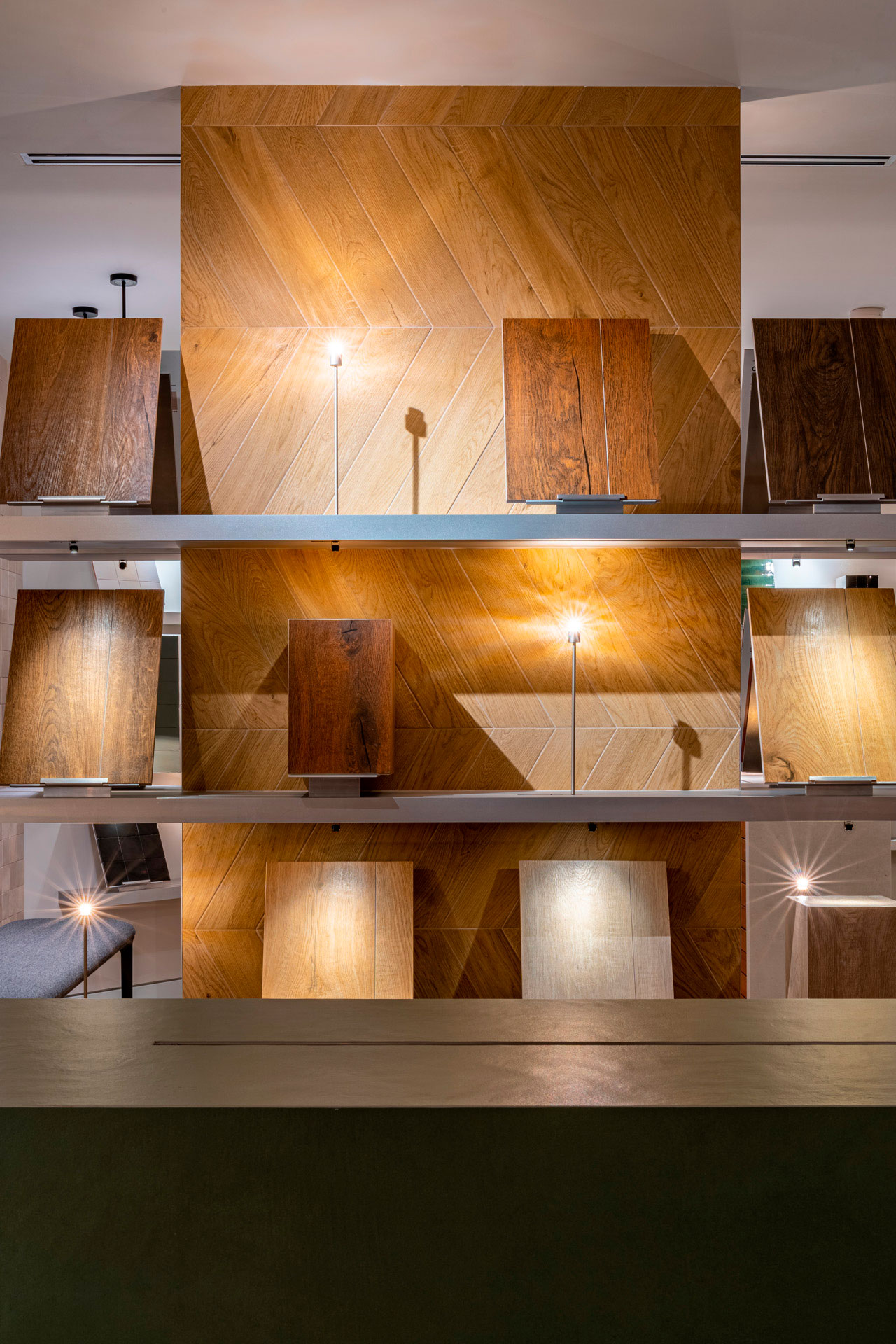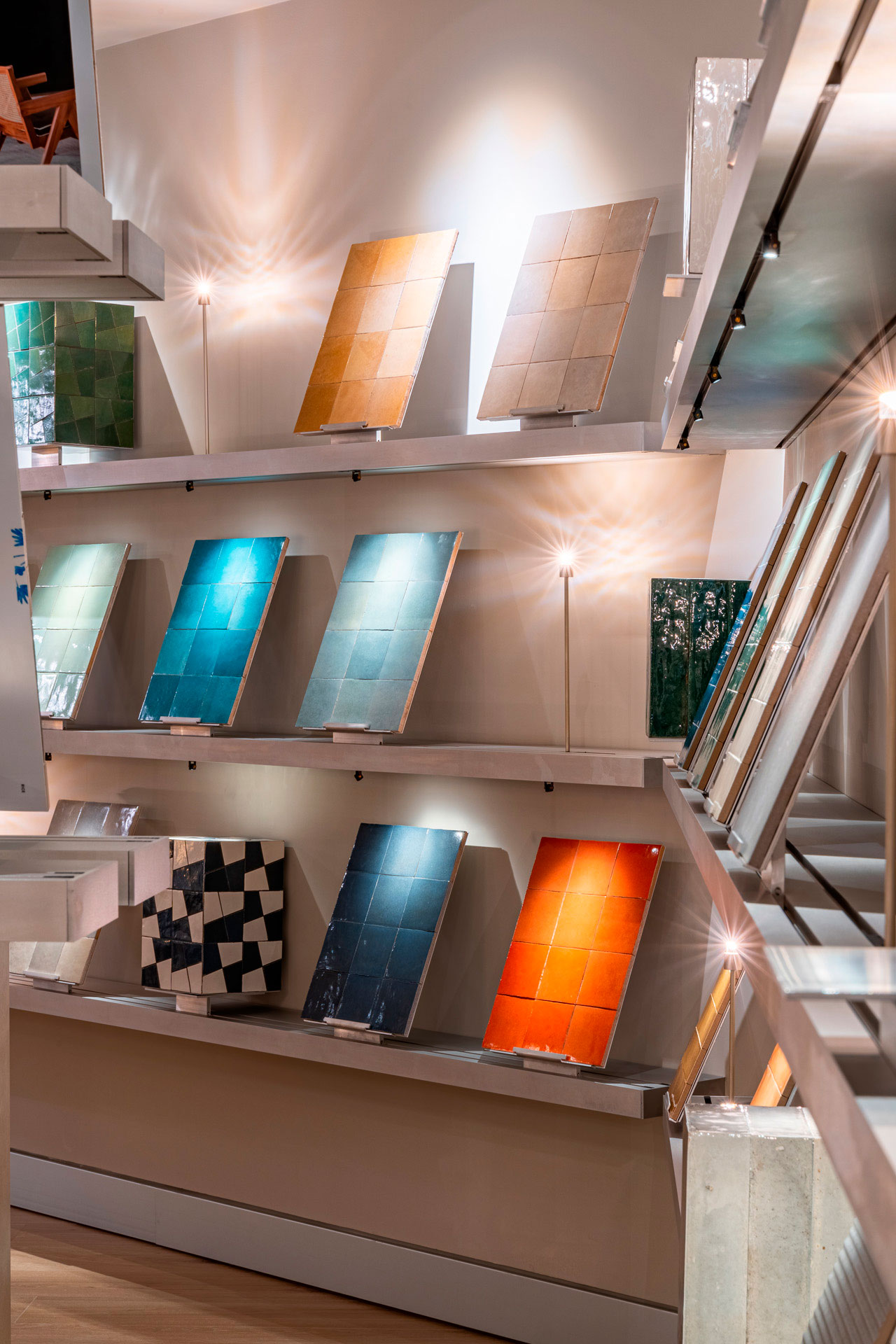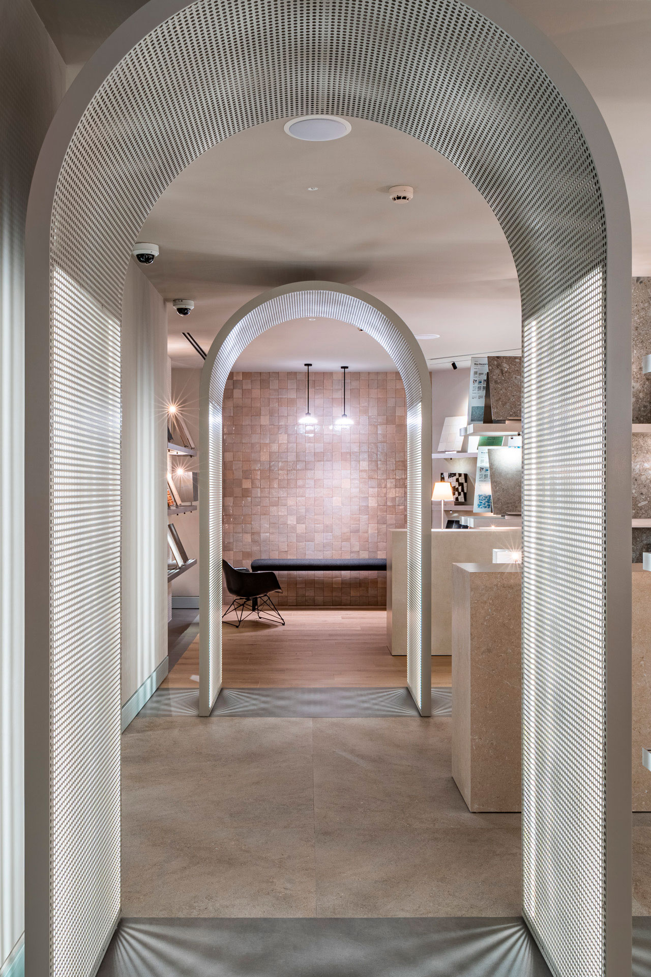 Der Entwurf stammt vom Büro ACPV ARCHITECTS Antonio Citterio Patricia Viel, das den 300 m2 großen Showroom mit Blick auf die zentralen Straßen Calle Serrano und Calle Juan Bravo im Zentrum der spanischen Hauptstadt neu gestaltet hat, um das umfangreiche Fliesensortiment von Marazzi unterzubringen.